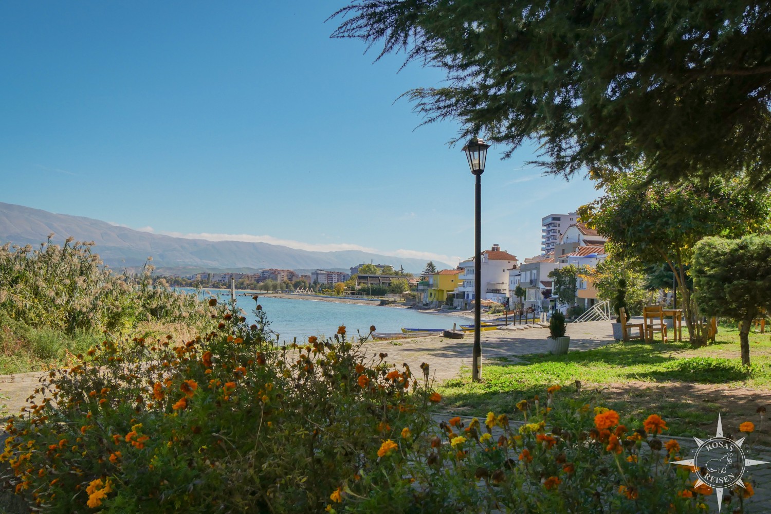 Während wir Nick lauschen und das uns zum Teil völlig unbekannte Land etwas besser kennenlernen, taucht am Horizont der Ohridsee auf. Der See liegt malerisch an der Grenze zwischen Albanien im Westen und Nordmazedonien im Osten. Mit einer Fläche von rund 358 km² und einer Tiefe von bis zu 288 Metern zählt er zu den tiefsten Seen Europas. Sein Alter wird auf ein bis drei Millionen Jahre geschätzt. Die albanischen Hauptorte am Seeufer sind Pogradec und Lin, die jeweils ihren ganz eigenen Charme versprühen.
