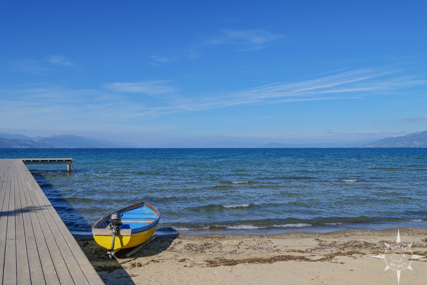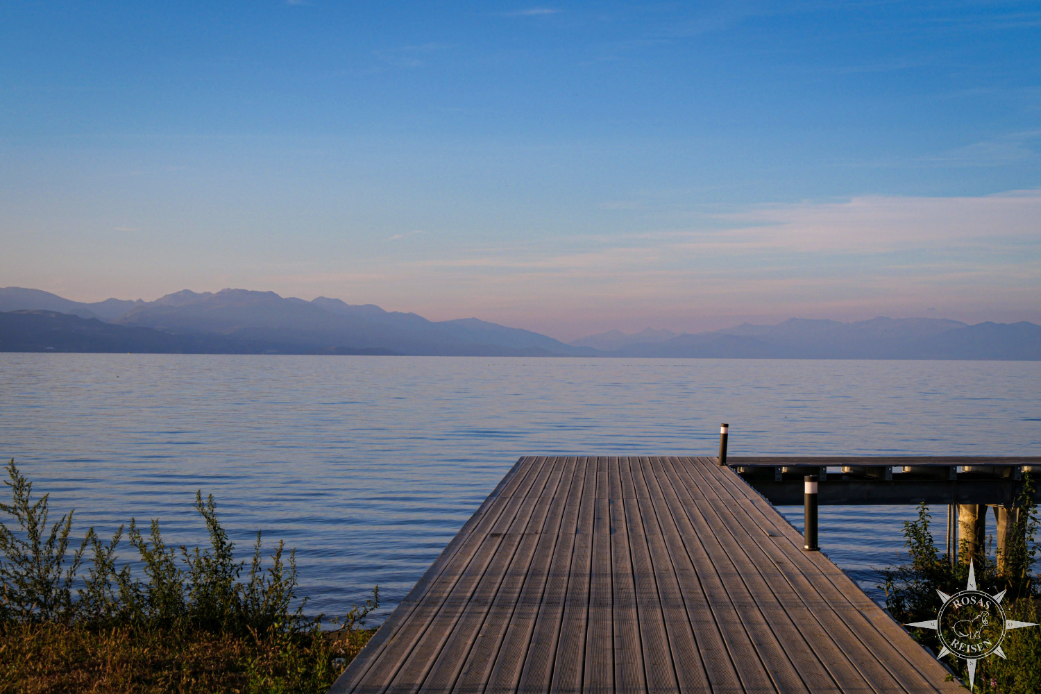 Ich genieße den Sonnenuntergang auf einem der Holzstege, die in den Ohridsee hineinragen und sehe zu, wie die leuchtende Scheibe rasch hinter den Bergen im Westen verschwindet. Das Dämmerlicht macht seinem Namen als Blaue Stunde alle Ehre und taucht den Horizont in unterschiedlichste Schattierungen jener Farbe. Ein beeindruckender Abschluss für den ersten richtigen Tag unserer Radreise durch Albanien.