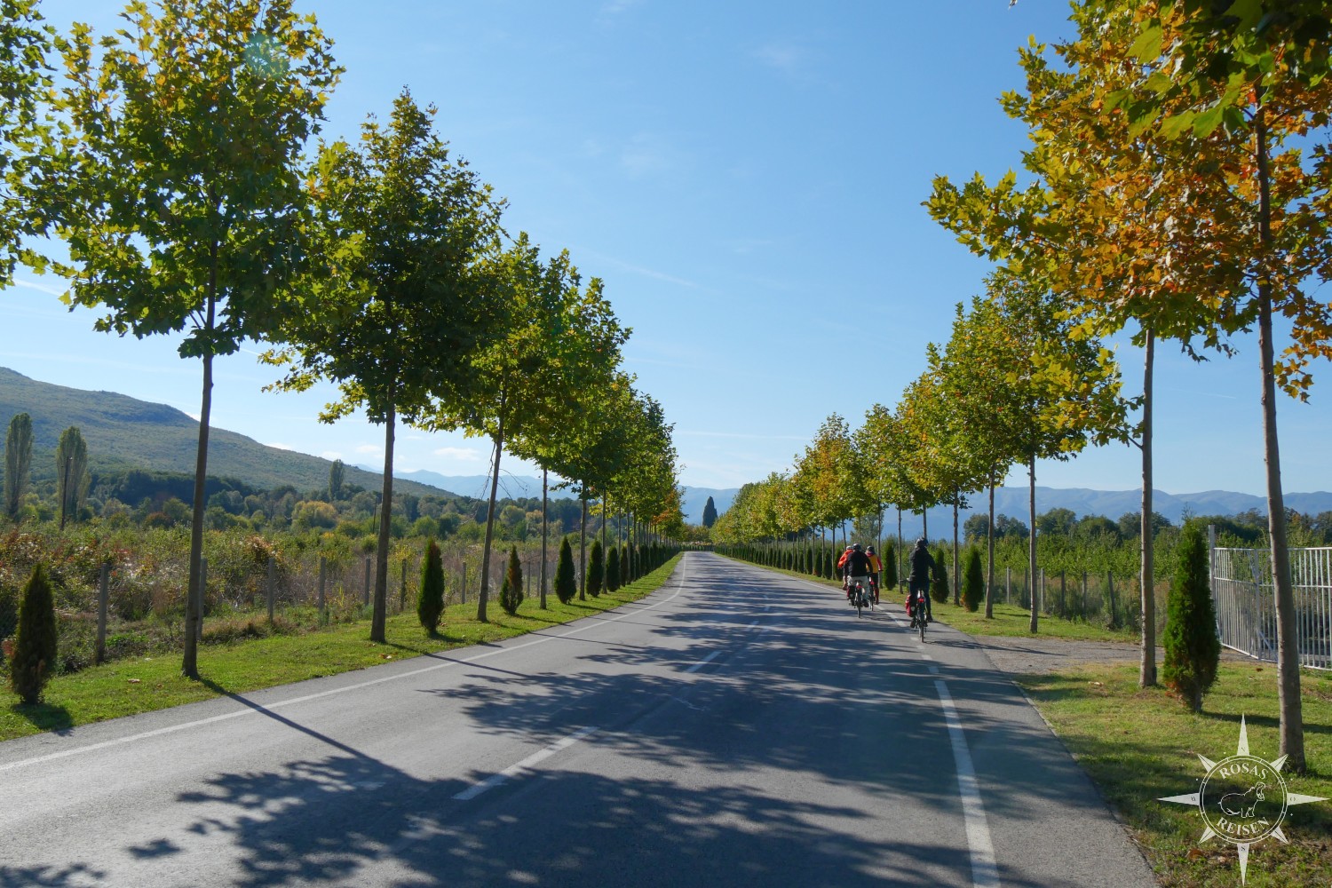 Nach dem Essen schwingen wir uns gesättigt wieder auf die Räder und überqueren die in nur ein paar hundert Meter Entfernung befindliche Grenze nach Nordmazedonien. Ein Grenzübertritt per Fahrrad, das ist ein Novum für mich. Unsere Ausweise werden inspiziert, dann dürfen wir unter den strengen Augen der grenzeigenen Katzenkontrolleure passieren.