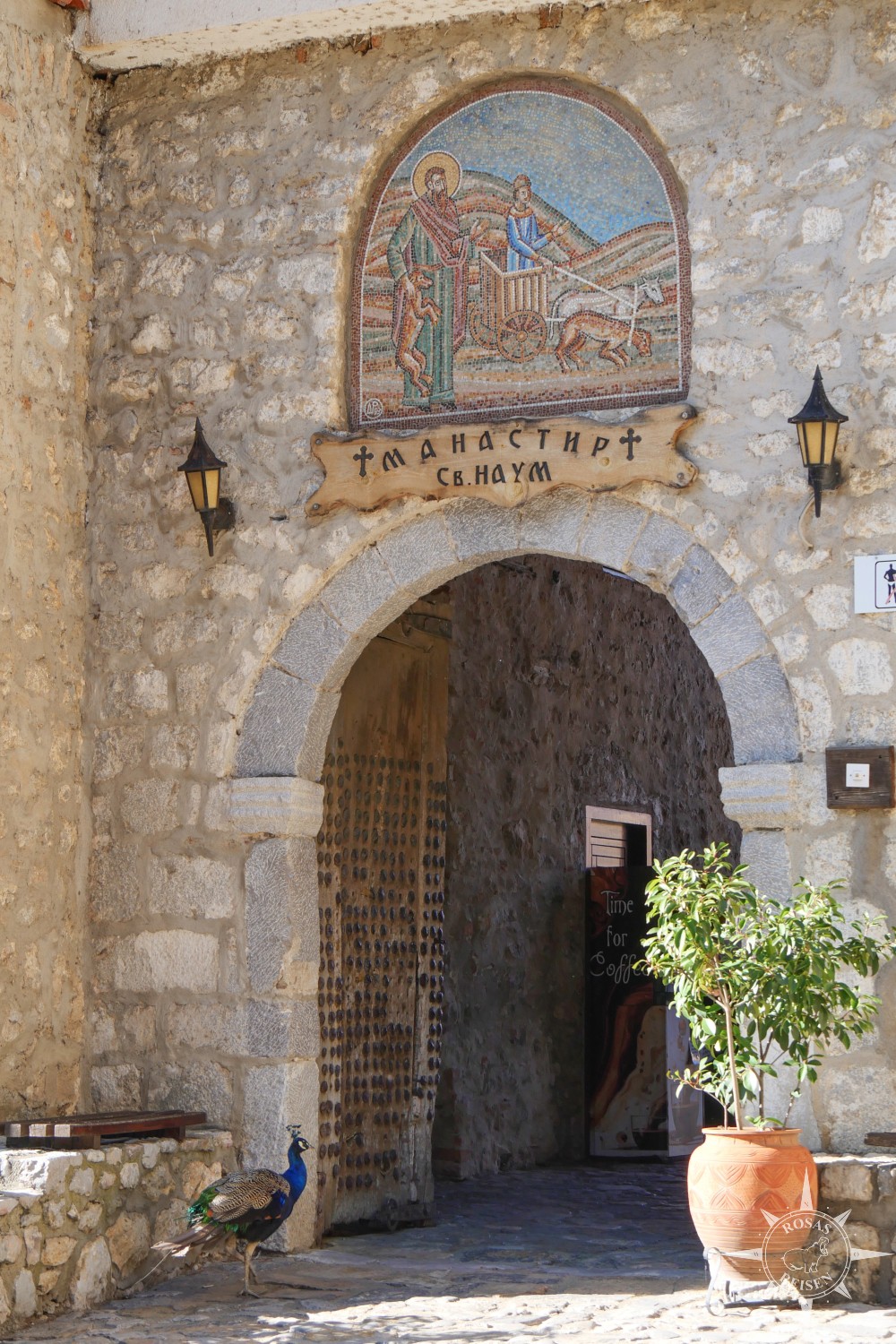 Ein paar Kilometer die Straße hinunter liegt das Kloster St. Naum, gegründet im 8. Jahrhundert und heute UNESCO-Weltkulturerbe. Eine hübsche, orthodoxe Anlage mit Kapelle und sozusagen Premiumlage direkt am Ohridsee. Abgesehen von der Kapelle mit ihren beeindruckenden Fresken, die Szenen aus dem Alten und Neuen Testament darstellen, gibt es hier eine kleine Gartenanlage und frei herumstreifende Pfauen zu entdecken, deren blaues Gefieder in der Sonne leuchtet. Ach ja, und eine katzige Einlasskontrolle gibt es hier auch!