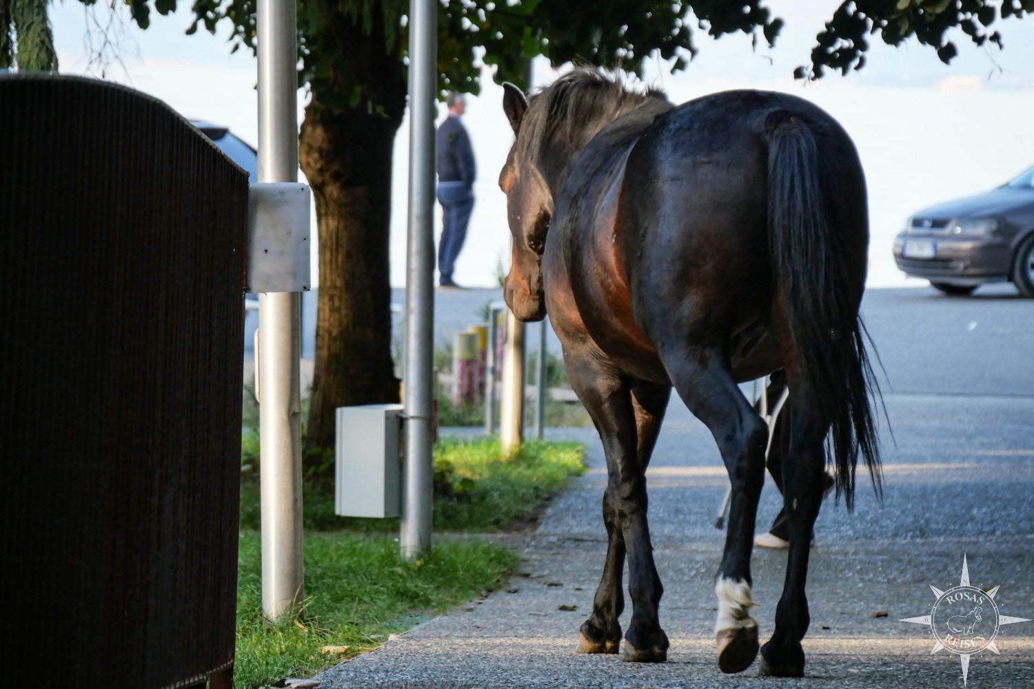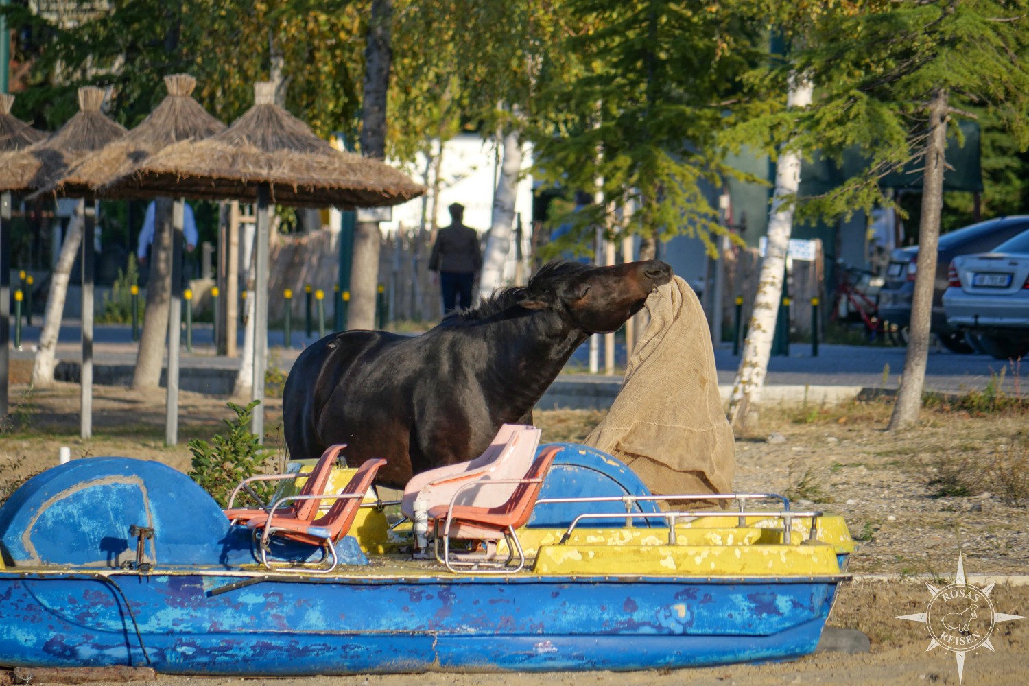 Nach unserer Rückkehr dorthin begebe ich mich noch auf einen kleinen Erkundungsgang auf Schusters Rappen. Dabei begegne ich einem tatsächlichem, einem schwarzen Pferd, das hier frei herumstreunt und sichtlich Spaß daran hat, am Strand für Unordnung zu sorgen. Es ist sozusagen Herr der Straße und hat gar keine Scheu, den Verkehr aufzuhalten und demonstrativ vor dem geschlossene Visitor Center einen Haufen Pferdeäpfel zu platzieren. Irgendwie ist mir das Tier direkt sympathisch.