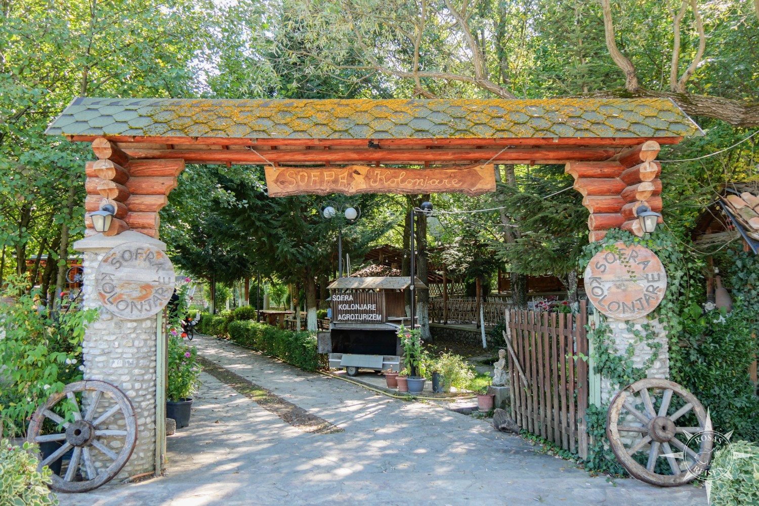 Im Garten des Hofs warten Zwiebeln und Kürbisse auf ihre Verarbeitung, in großen Metallkörben stapelt sich der Mais, der hier nicht nur als Viehfutter, sondern auch als Grundnahrungsmittel dient. Ein Torbogen überspannt den Eingang zum Hof, und verlässt man das Gelände, liest man auf einem Schild das albanische Wort für „Danke“: Faleminderit. Hier ist es so schön, dass ich gerne noch länger verweilen würde, doch die Tassen sind leer und die Straße ruft. Schließlich gilt es noch einiges an Strecke zu bewältigen.