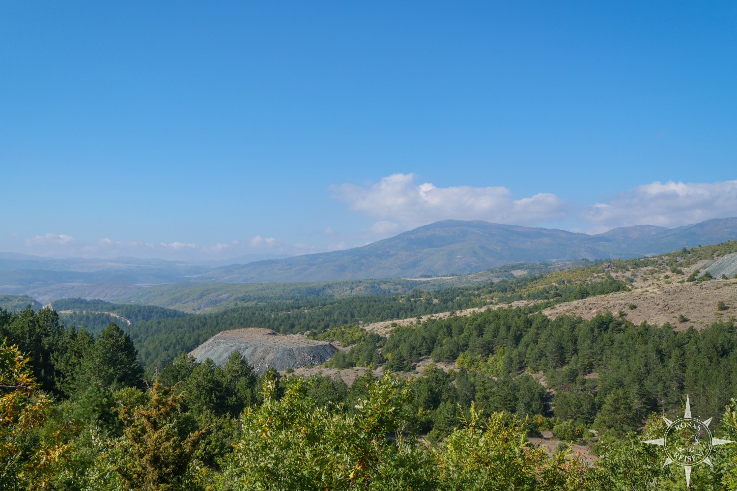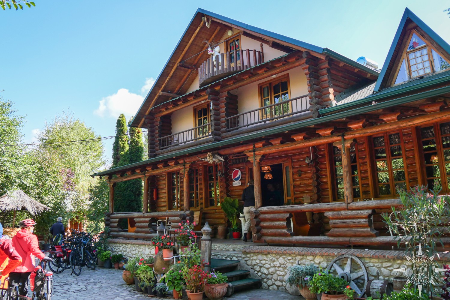 Wir lassen also Korça, das Paris Albaniens hinter uns und radeln los Richtung Süden. Nach einigen Kilometern machen wir – wie jeden Tag – eine Pause für einen kleinen Kaffeestopp. Heute findet dieser in einem schönen Holzhaus mit Namen Sofra Kolonjare statt, das mich an die Blockhütten in Kanada erinnert. Wir sitzen auf der Terrasse in der Sonne, ordern Heißgetränke und genießen Äpfel und Kekse.