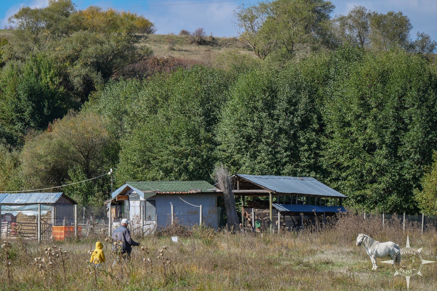 Auf der Wiese des Nachbarhofs füttern ein kleines Mädchen und ein alter Mann gemeinsam ein weißes Pony. Es fühlt sich an, wie eine zeitlose Szene aus einem Roman und ich habe fast das Gefühl, ein Eindringling in dieser Idylle zu sein. Doch als sie mich entdecken, winken die beiden freundlich.
