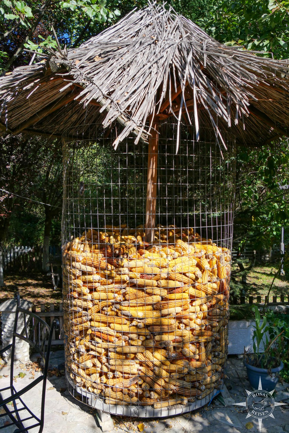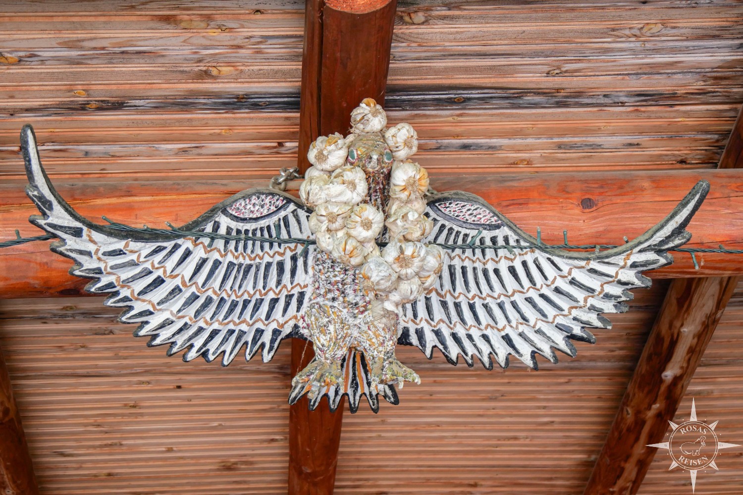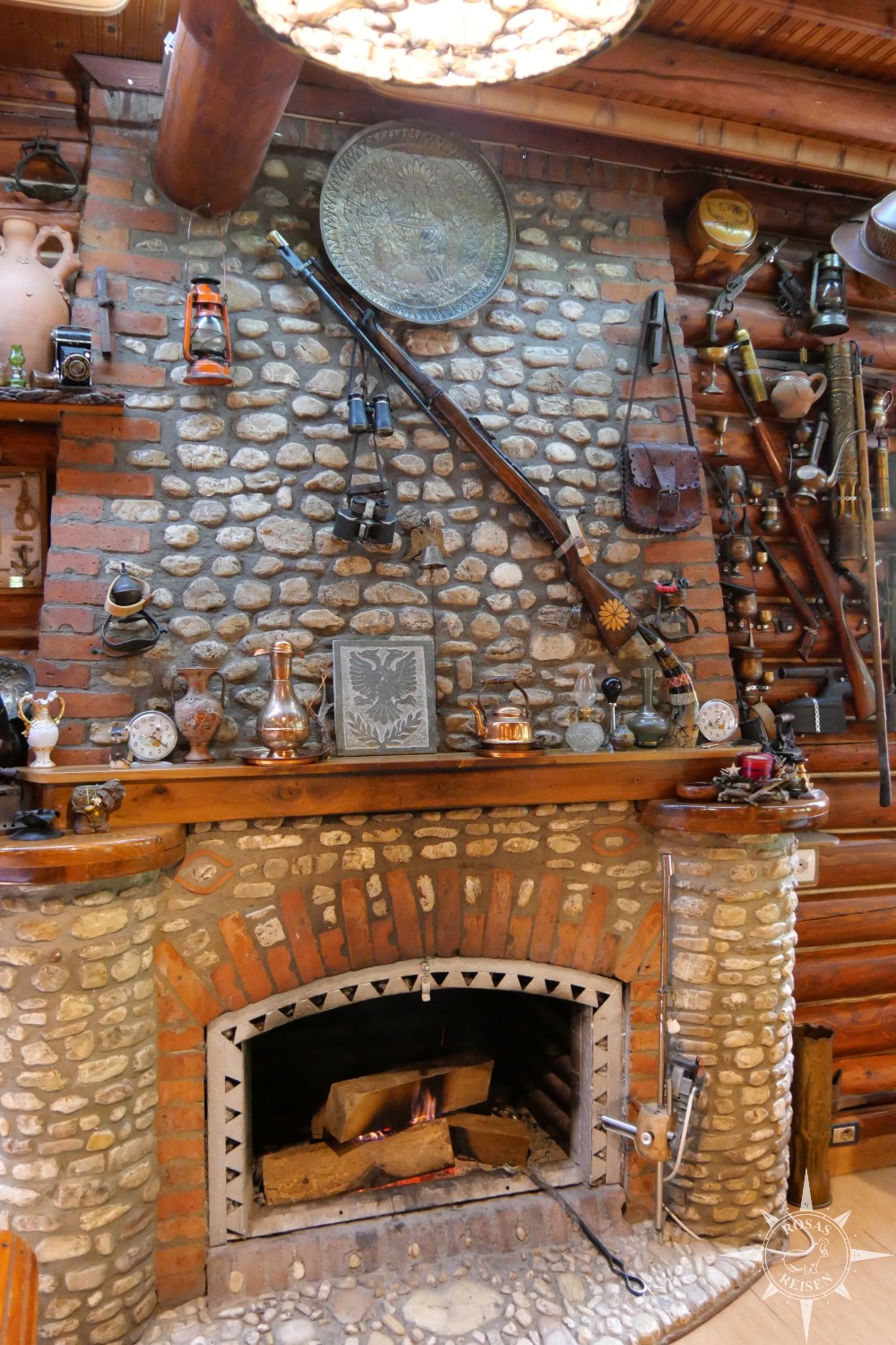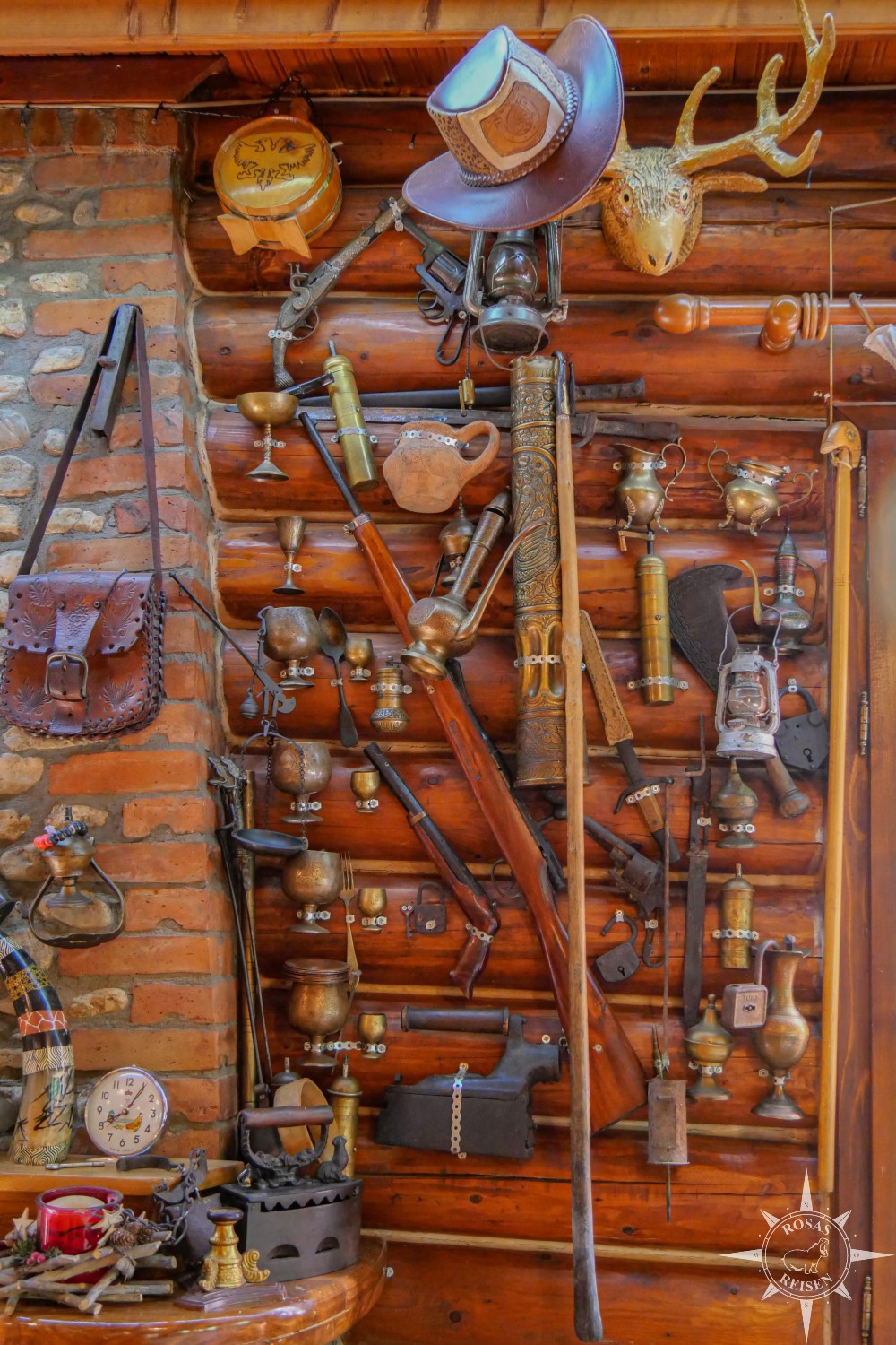 Lange kann ich aber natürlich nicht still sitzen, und so stromere ich ein wenig herum. Im Inneren der Hütte finden sich jede Menge spannender Kleinigkeiten, die es zu entdecken und zu bestaunen gilt: ein riesiger Vogel mit Knoblauchkranz, alte Waffen und Petroleumlampen an den Wänden, goldene Kelche, Trachten und allerlei Kuriositäten.