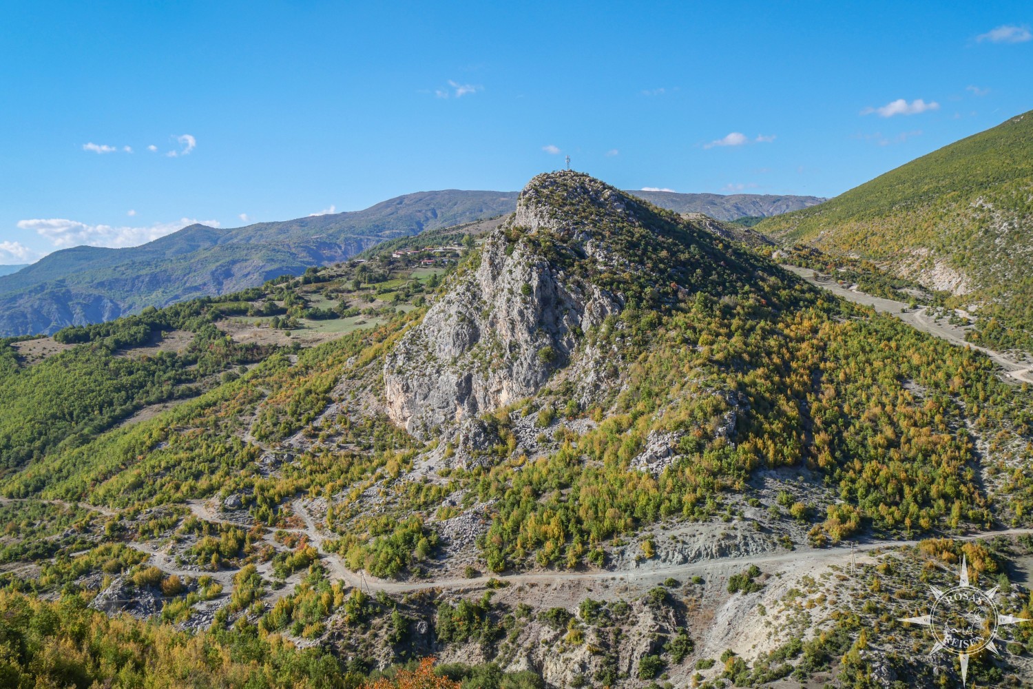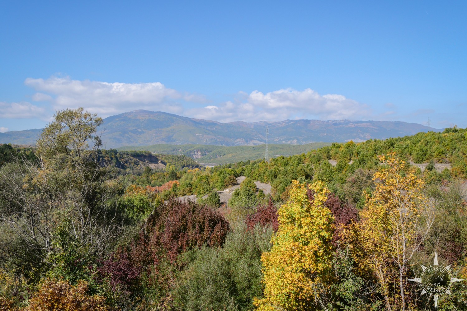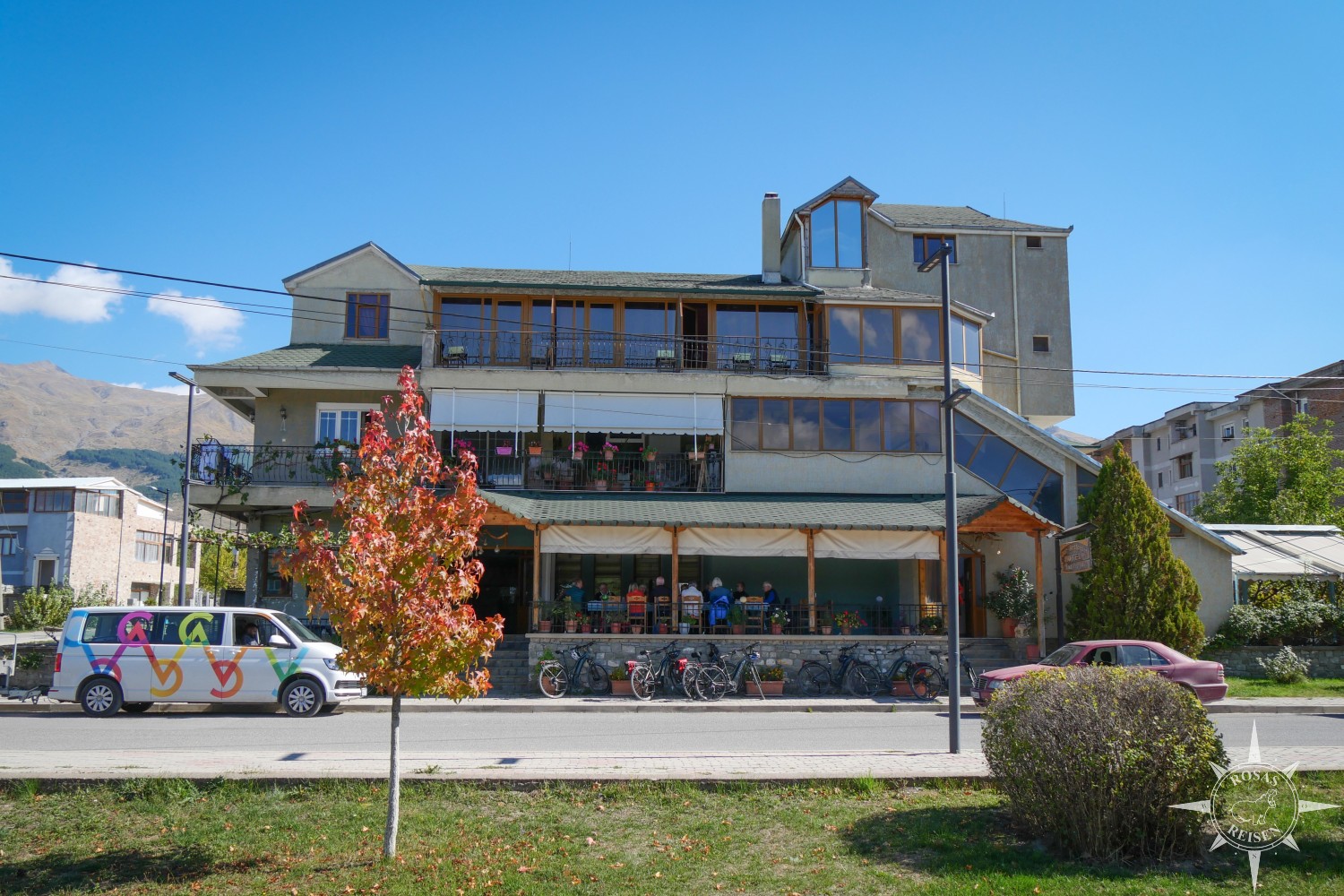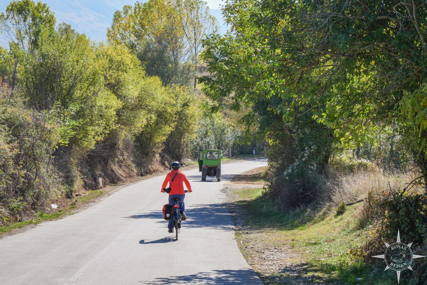 Liest man meine Artikel über Tirana, den Ohridsee und Korça, so bemerkt man vielleicht, dass Albanien mein Herz noch nicht im Sturm erobert hat. Doch heute, heute ist der Tag, an dem sich das ändert, denn heute fahren wir mit unseren E-Rädern in die Berge! Wir treten in die Pedale, die Motoren der E-Bikes surren leise, und jeder Tritt bringt uns ein Stück weiter hinein in eine Landschaft, die wie gemalt wirkt: gelbe, rote und orangefarbene Blätter flirren im Licht, während die Berge im Hintergrund in Blau und Grau schimmern. Heute werden wir Albanien neu erleben, auf Schotterwegen, durch stille Dörfer und über sonnenbeschienene Bergstraßen, die wir uns mit Pferden, Ziegen und neugierigen Blicken der Einheimischen teilen.