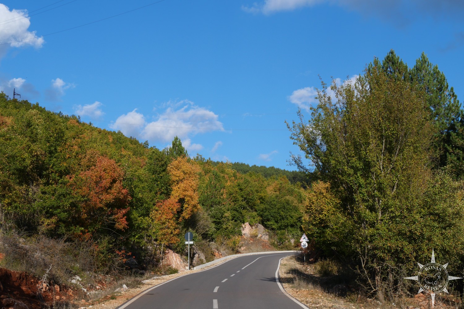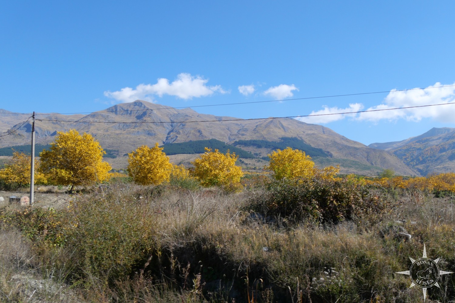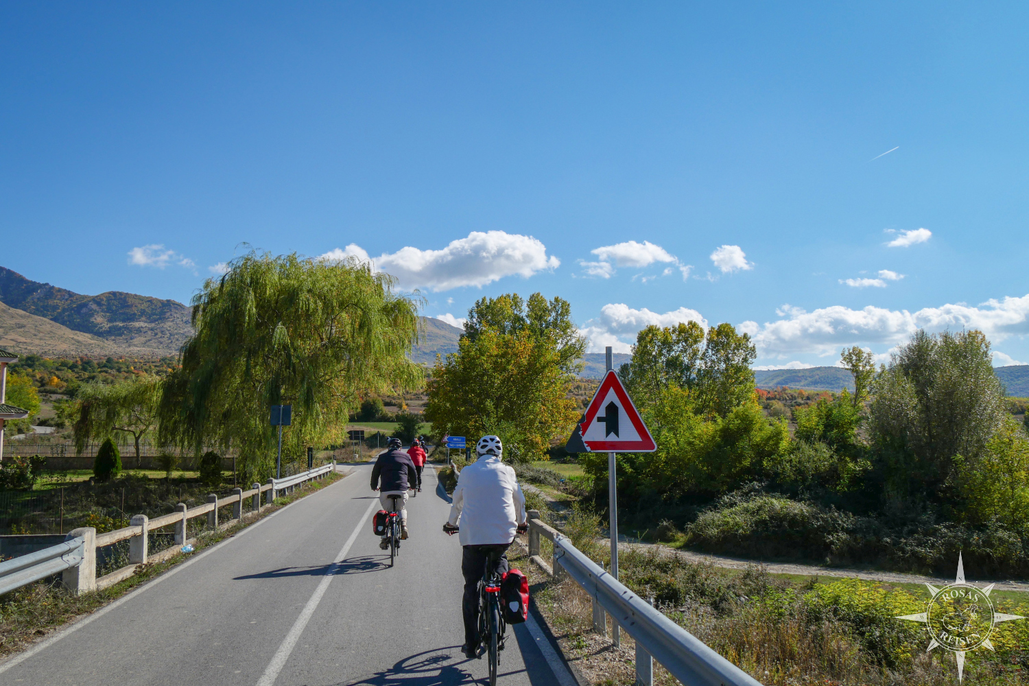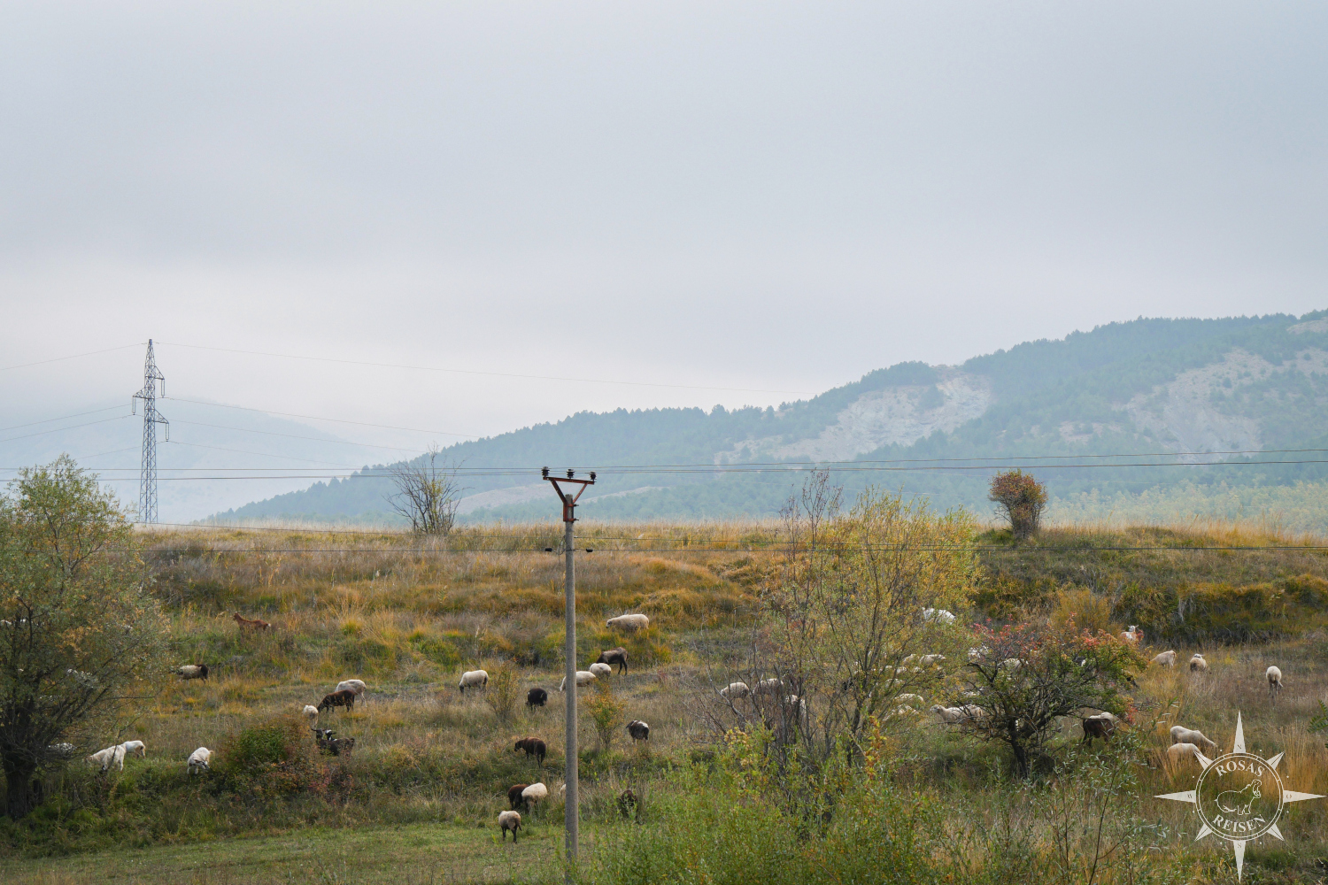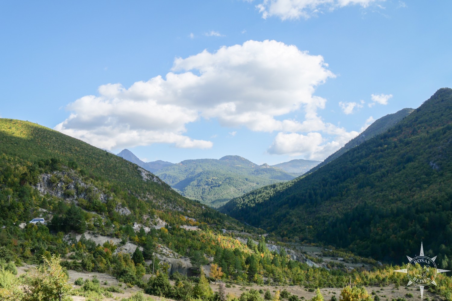 Liest man meine Artikel über Tirana, den Ohridsee und Korça, so bemerkt man vielleicht, dass Albanien mein Herz noch nicht im Sturm erobert hat. Doch heute, heute ist der Tag, an dem sich das ändert, denn heute fahren wir mit unseren E-Rädern in die Berge! Wir treten in die Pedale, die Motoren der E-Bikes surren leise, und jeder Tritt bringt uns ein Stück weiter hinein in eine Landschaft, die wie gemalt wirkt: gelbe, rote und orangefarbene Blätter flirren im Licht, während die Berge im Hintergrund in Blau und Grau schimmern. Heute werden wir Albanien neu erleben, auf Schotterwegen, durch stille Dörfer und über sonnenbeschienene Bergstraßen, die wir uns mit Pferden, Ziegen und neugierigen Blicken der Einheimischen teilen.