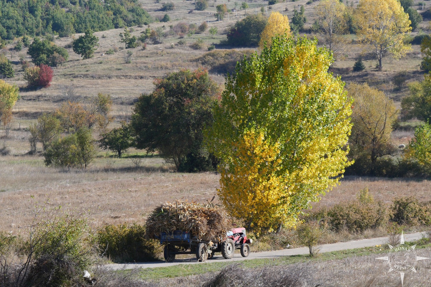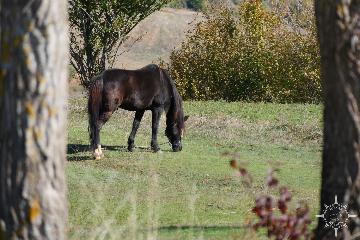 Unser Weg führt an den Ställen der Farm vorbei, in und vor denen dösende Pferde stehen. Über eine große Wiese und durch den in der Abendsonne glühenden Herbstwald spazieren wir, bis wir wieder auf eine Straße mitten durchs albanische Nirgendwo treffen.