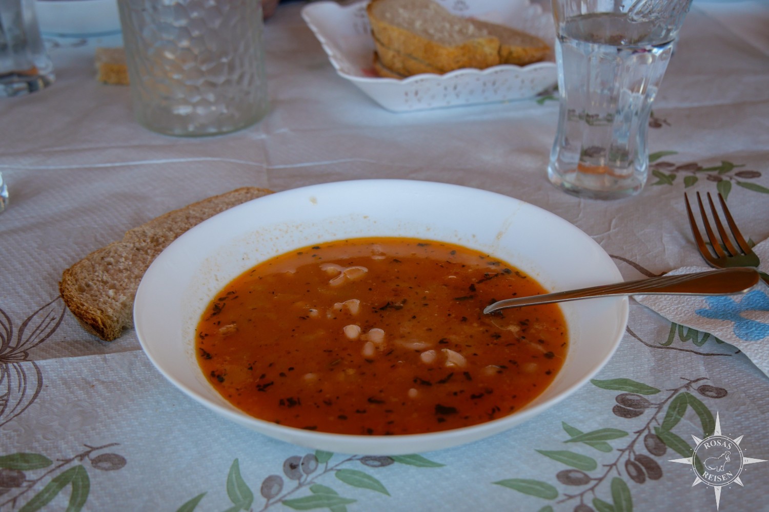 Ich habe Glück und wähle offenbar den richtigen Weg, denn in Erseka treffe ich die anderen wieder. Die kleine Stadt ist das administrative Zentrum der Region Kolonja und bekannt für ihr kühleres Bergklima. Davon ist heute aber nicht viel zu merken. Wir nehmen Platz mit Blick auf einen sonnenbeschienenen Park, während uns eine würzige Suppe mit weißen Bohnen serviert wird – Hülsenfrüchte gehören hier seit jeher zur Alltagsküche –, gefolgt von Reis, Spinat, Kartoffelpüree und Gemüse.