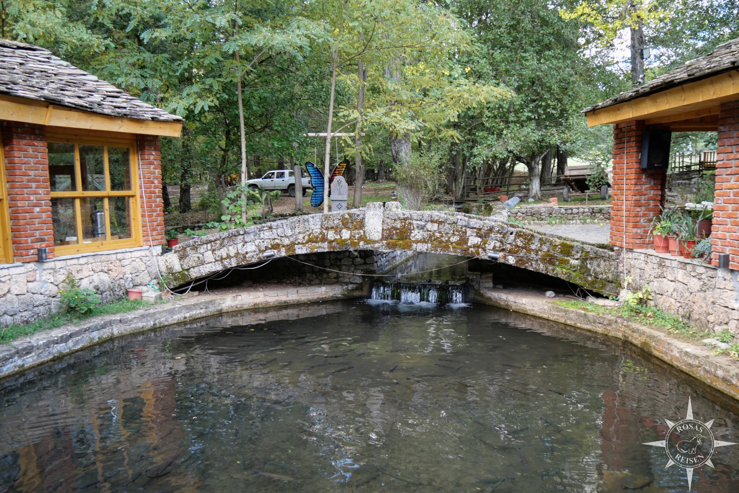 Als sich die Schatten immer länger werden und die Dämmerung, gefolgt von ungestörter Dunkelheit, über die Wiese senkt, bin ich dankbar für den wärmenden Heizlüfter. Einmal raus muss ich aber dennoch, denn hungrig will ich nicht ins Bett gehen. Wobei das Abendessen heute ausnahmsweise nicht ganz so vegetarisch ausfällt. Auf den Tellern meiner Mitradler landen Forellen aus den farmeigenen Teichen und Lamm. Und auch, wenn ich bereits jetzt meinem verwöhnten Gaumen anmerke, dass er sich doch etwas mehr Abwechslung wünschen würde, begnüge ich mich mit dem üblichen Brot und Gemüse. Wir wollten authentisches Albanien, da sollten wir uns jetzt nicht beschweren, wenn wir es auch bekommen!