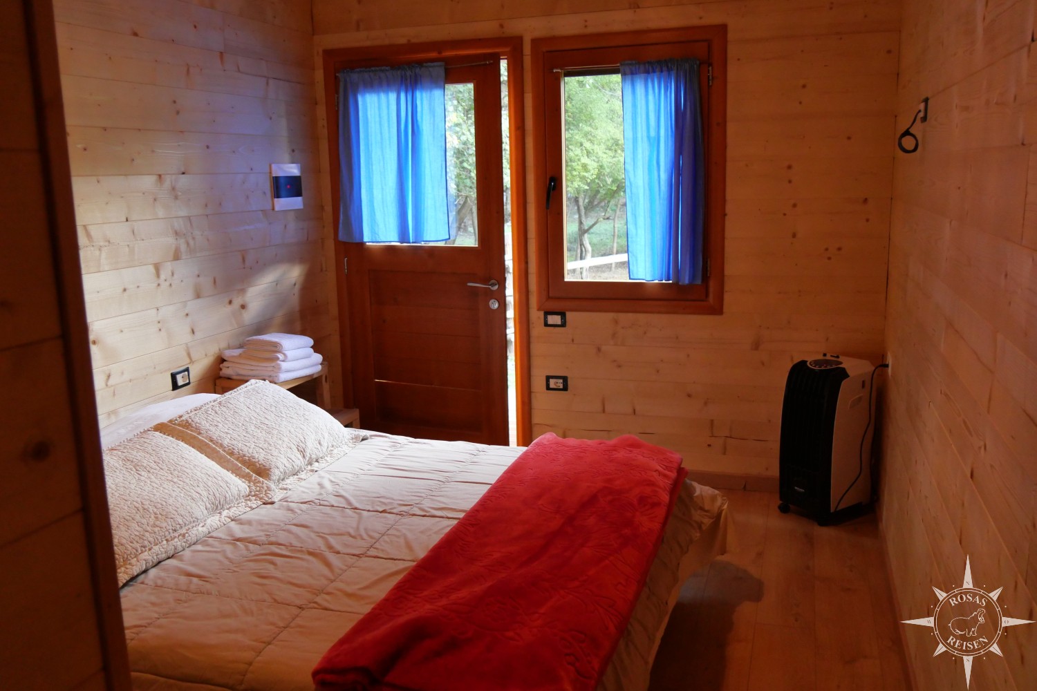 Zum Heizen sind manche Hütten mit Kaminen ausgestattet, meine Einzelhütte verfügt über einen elektrischen Heizlüfter, der im Handumdrehen für wohlige Wärme sorgt. Denn obwohl gerade noch die Sonne vom Himmel strahlt, wird es nicht mehr lange dauern, bis sie hinter den Bergen verschwindet und die Temperaturen fallen.