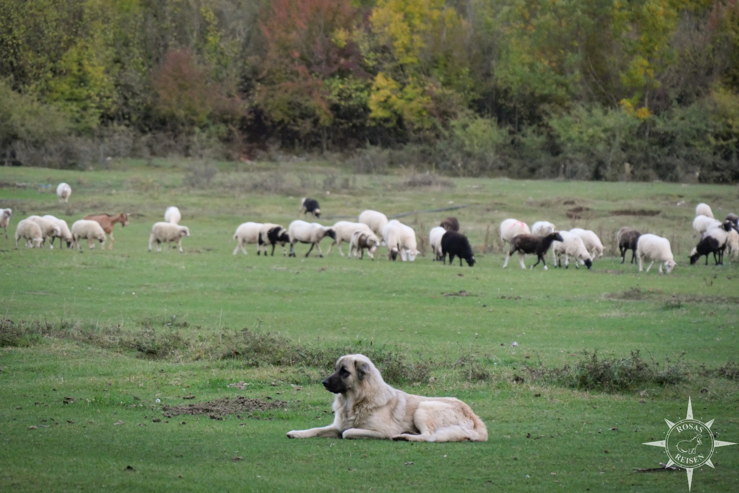 Hier oben wird es abends schnell kühl, und als die Sonne den Horizont berührt, machen wir uns auf den Rückweg zu unseren Hütten. Auf der Wiese davor hat sich mittlerweile eine Schafherde eingefunden, bewacht von großen, ihren Job sehr ernst nehmenden Hütehunden.