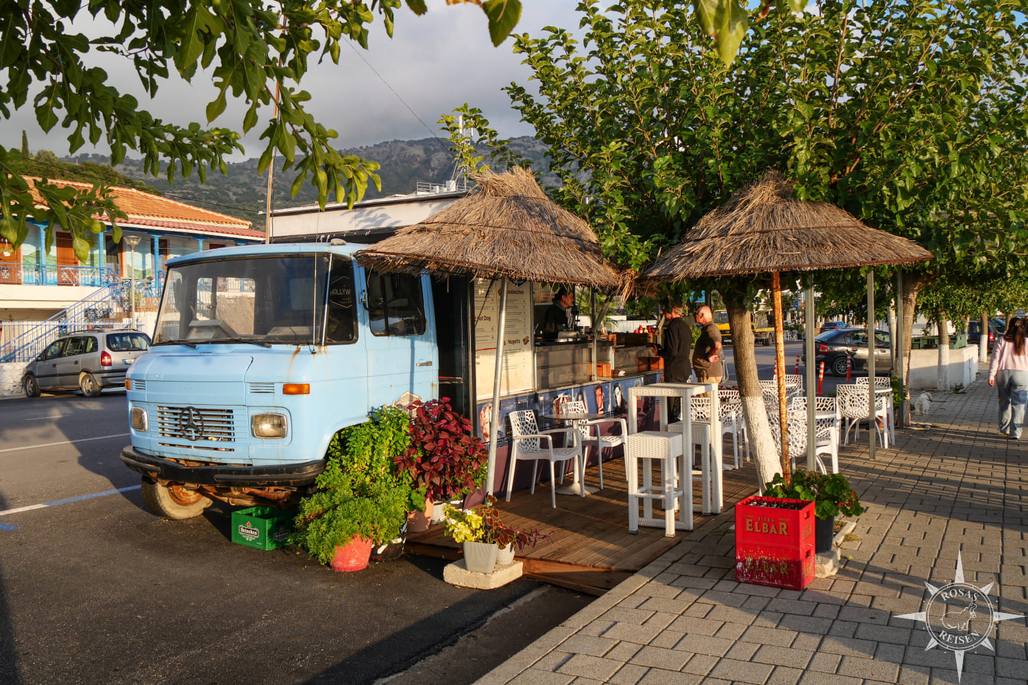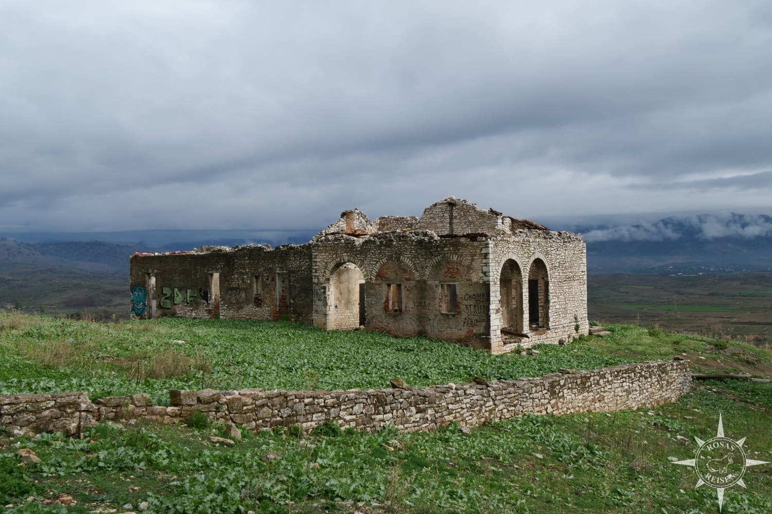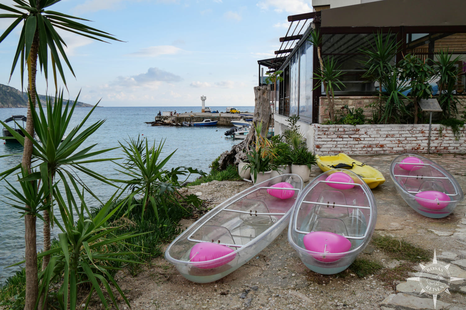 Bald ist es Zeit für die Mittagspause und die machen wir in Porto Palermo, auf einer Terrasse mit Blick auf die leuchtend türkisfarbene Bucht. Diese liegt an der südlichen albanischen Riviera zwischen den steilen Hängen des Ceraunischen Gebirges. Durch ihre halbkreisförmige Form und den schmalen Zugang bietet sie natürlichen Schutz vor Wind und Seegang. Bereits in der Antiken wurde der Hafen unter dem Namen Panormus erwähnt und als sicherer Ankerplatz genutzt.