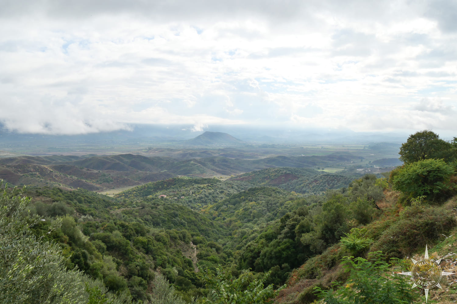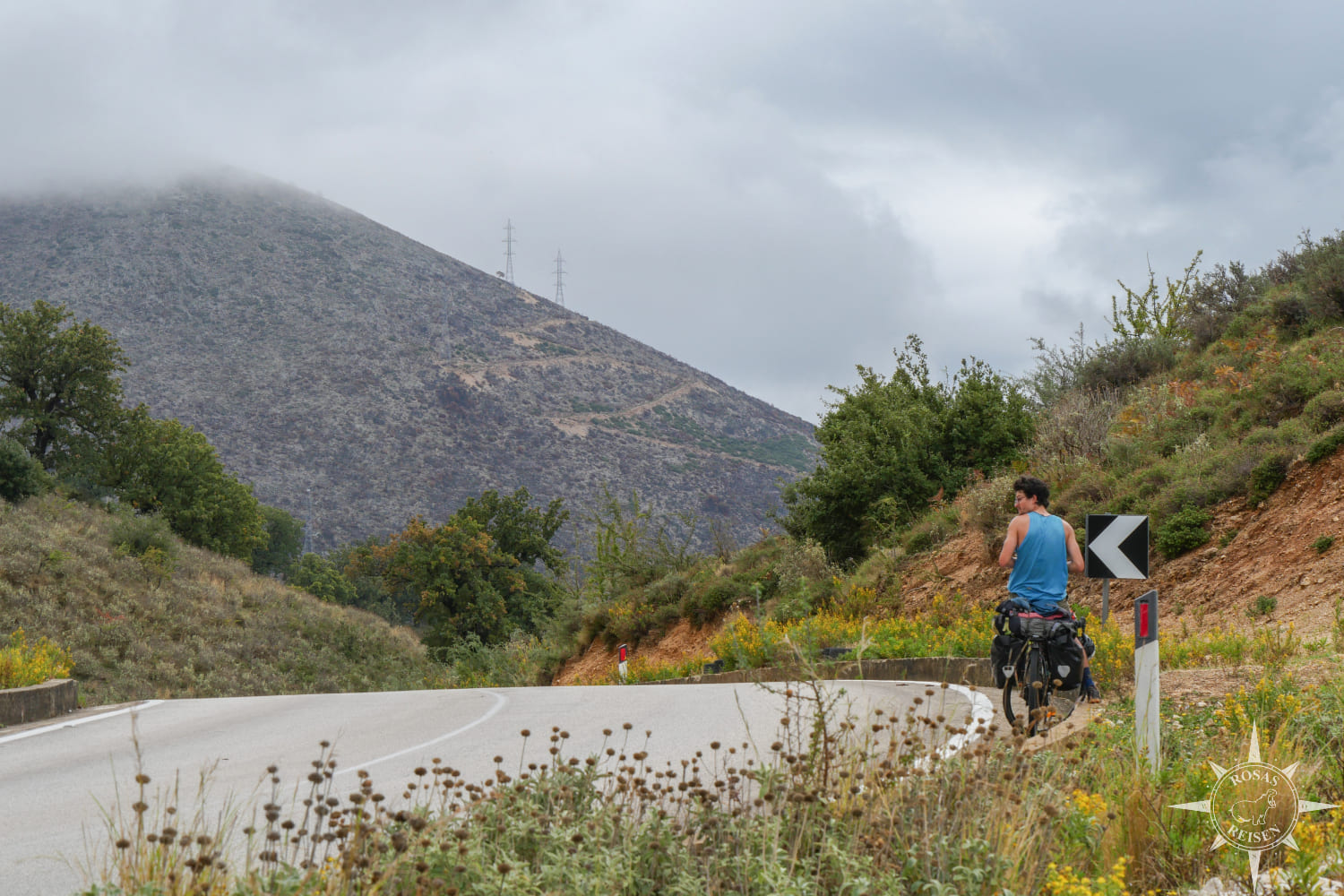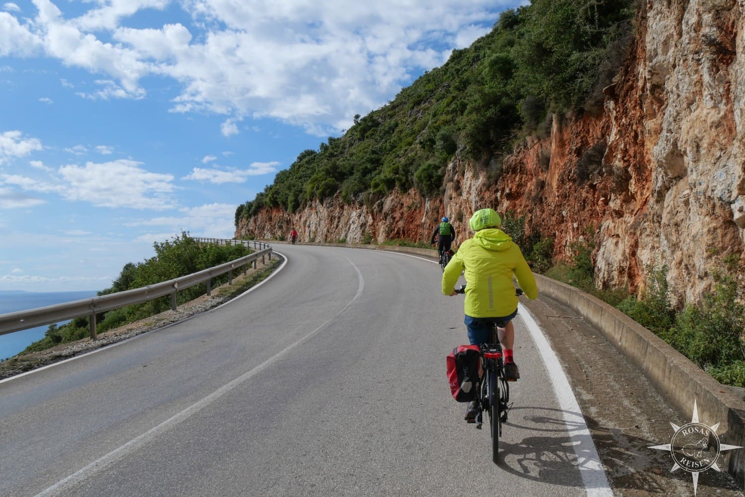 Wir lassen schnell den etwas unübersichtlichen Verkehr von Saranda hinter uns und radeln drauf los ins Hinterland. Hier gibt es nicht viel zu sehen und da es nieselt, beeilen wir uns, voran zu kommen. Bald bricht die Sonne durch die Wolken und das Meer kommt wieder in Sicht. Wir fahren steile Etappen, die die Akkus unserer E-Bikes ganz schön leersaugen. Gut, dass unser Begleitbus mit Ersatzakkus immer ein Stück hinter uns fährt. Wenn einem der Saft ausgeht, kann man einfach tauschen.