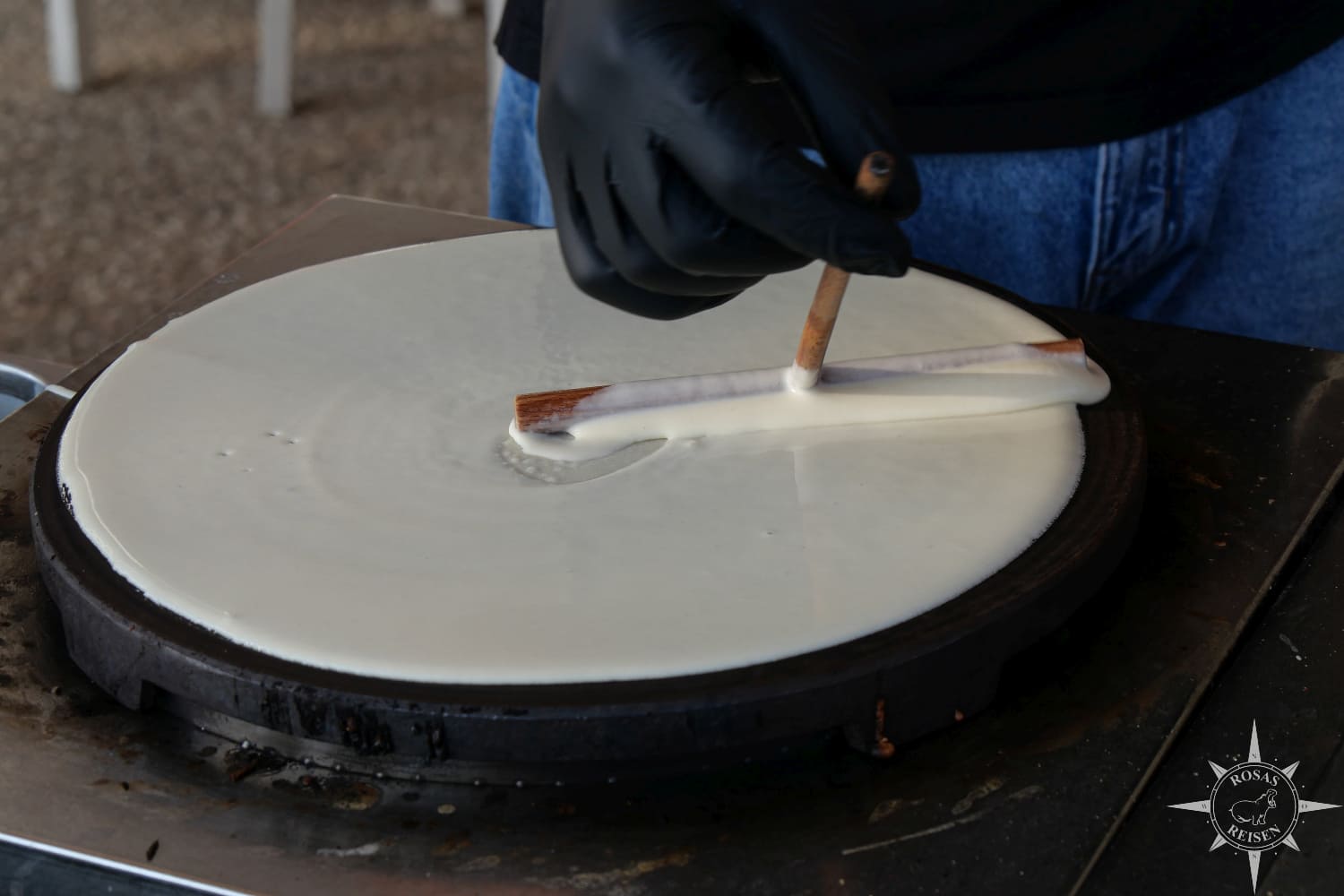 Der junge Mann, der die Süßspeisen fachmännisch zubereitet, erzählt uns, dass er ein Jahr als Koch in Leipzig gearbeitet hat. Seine Expertise schmeckt man, denn die Crêpes sind köstlich. So etwas leckeres habe ich hier gar nicht erwartet, denke ich. Im gleichen Moment frage ich mich: Und warum nicht? Wieso sollte es hier keine leckeren Crêpes geben? Sind wir da mal wieder den eigenen Vorurteilen aufgesessen, dass Menschen in touristischen Zentren nur schrottige oder minderwertige Ware anbieten? Vielleicht. Umso schöner, hier eines Besseren belehrt zu werden.