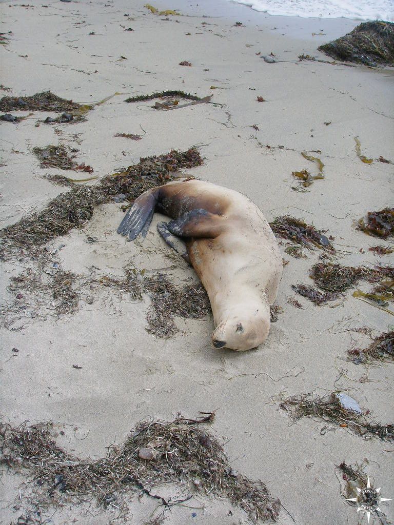Während eines Strandspaziergangs entdecke ich etwas in einer Bucht. Erst denke ich, es wäre ein Haufen Seetang, aber als ich näher komme, entpuppt sich der braune Klumpen als Seelöwe. Völlig regungslos liegt er da und in mir steigt Entsetzen hoch, weil ich denke, er sei tot oder zumindest krank. Ratlos setze ich mich auf den Sand. Was soll ich denn jetzt machen? Ich kann grundsätzlich kein Tier leiden sehen und überlege, ob ich ihm irgendwie helfen kann. Bewegt er sich überhaupt noch? Vorsichtig rutsche ich näher ran.