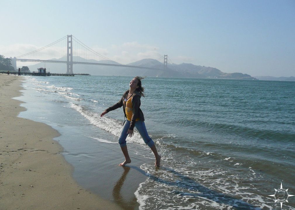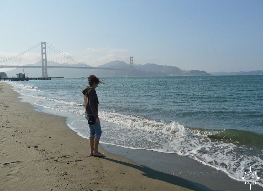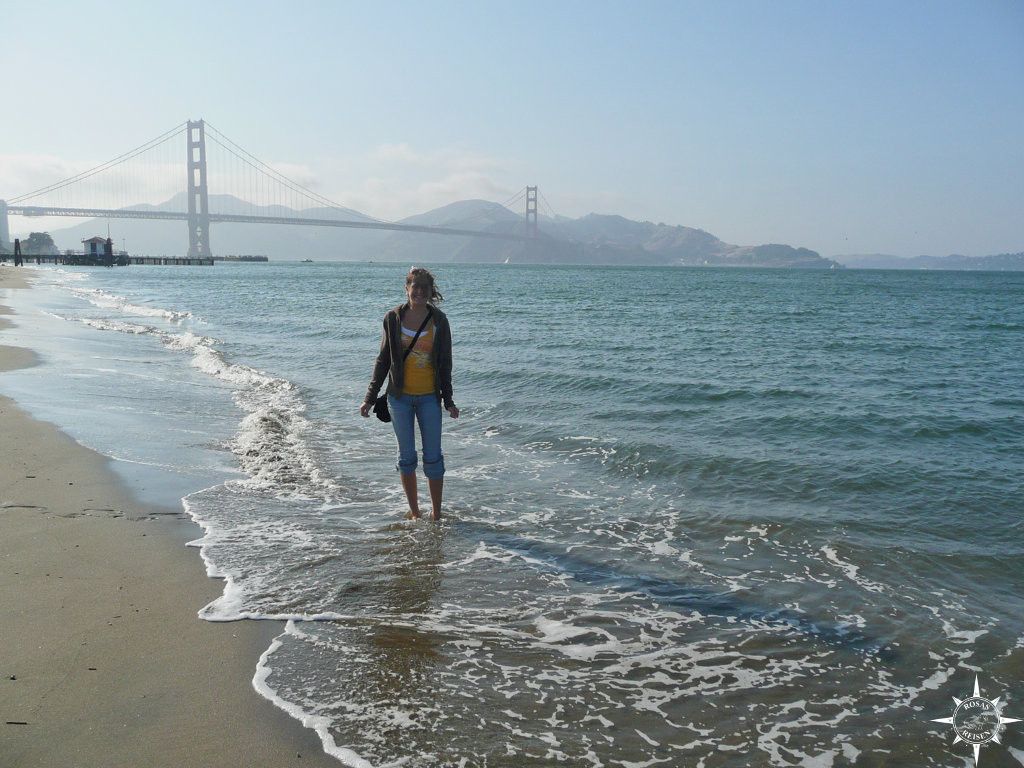 Nachdem wir im Francis Drake eingecheckt haben, wollen wir am ersten Abend noch einen Eindruck von der Stadt bekommen. Mit den Cable Cars geht es in den Marina District. Auf dem Weg zum Wasser schaffe ich es, irgendwo eine Blume abzurupfen, die ich mir ins Haar wurstel. Muss sein, denn gleich…ja! Da ist die Golden Gate Bridge, Wahrzeichen der Stadt, Tor zur Welt. Scott McKenzie dröhnt mir gedanklich in den Ohren, als ich zum Wasser hopse.
