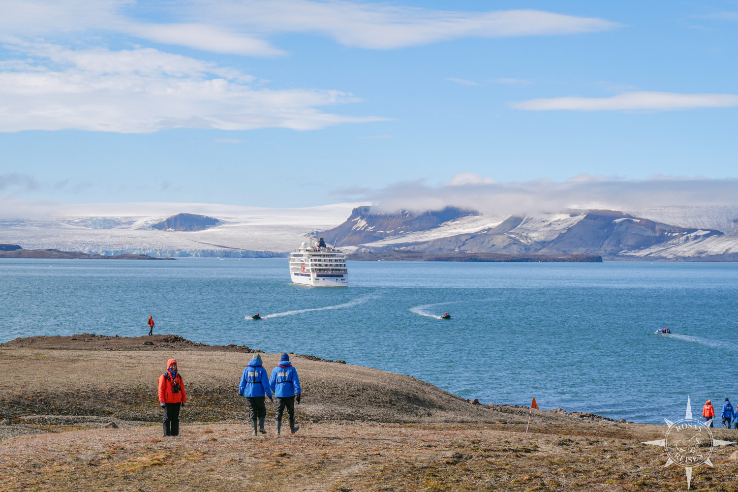 Ich beziehe also meine Position und lasse den Blick über die Bucht schweifen. Von der Ladestelle geht es einen gleichmäßigen Anstieg hinauf auf eine etwa 100 m hohe Seitenmoräne. Wir haben den Weg, dem gefolgt werden soll, genau mit Flaggen markiert, den der Boden ist hier sehr feucht und schlammig. Das bedeutet, er könnte großen Schaden nehmen, wenn er von 100 Paar Gummistiefeln bearbeitet wird. Daher haben wir einen Pfad angelegt, der hauptsächlich über Geröll und Gestein verläuft. Denn auch das gehört zu unseren Aufgaben hier auf Spitzbergen. Wir wollen unseren Gästen nicht nur die Schönheit der Natur zeigen, sondern diese zugleich auch so gut wir können schützen.