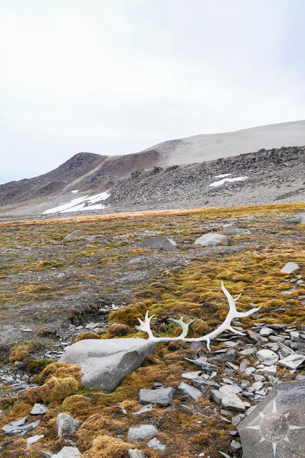 Die historischen Fakten zu diesem Ort haben sich mit dem oben genannten bereits erschöpft und so gibt es für mich als Historikerin an dieser Landestelle gar nicht so viel zu erzählen. Ich bin daher sehr dankbar, als ich ein Stück von einem Rentiergeweih finde, neben das ich mich stellen kann. So habe ich zumindest etwas, was ich den Passagieren und Passagierinnen zeigen kann.
