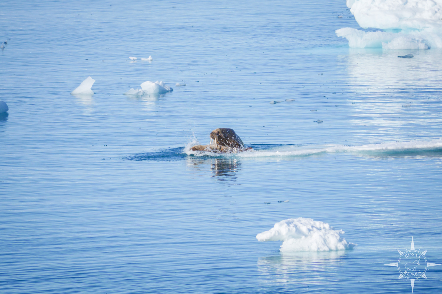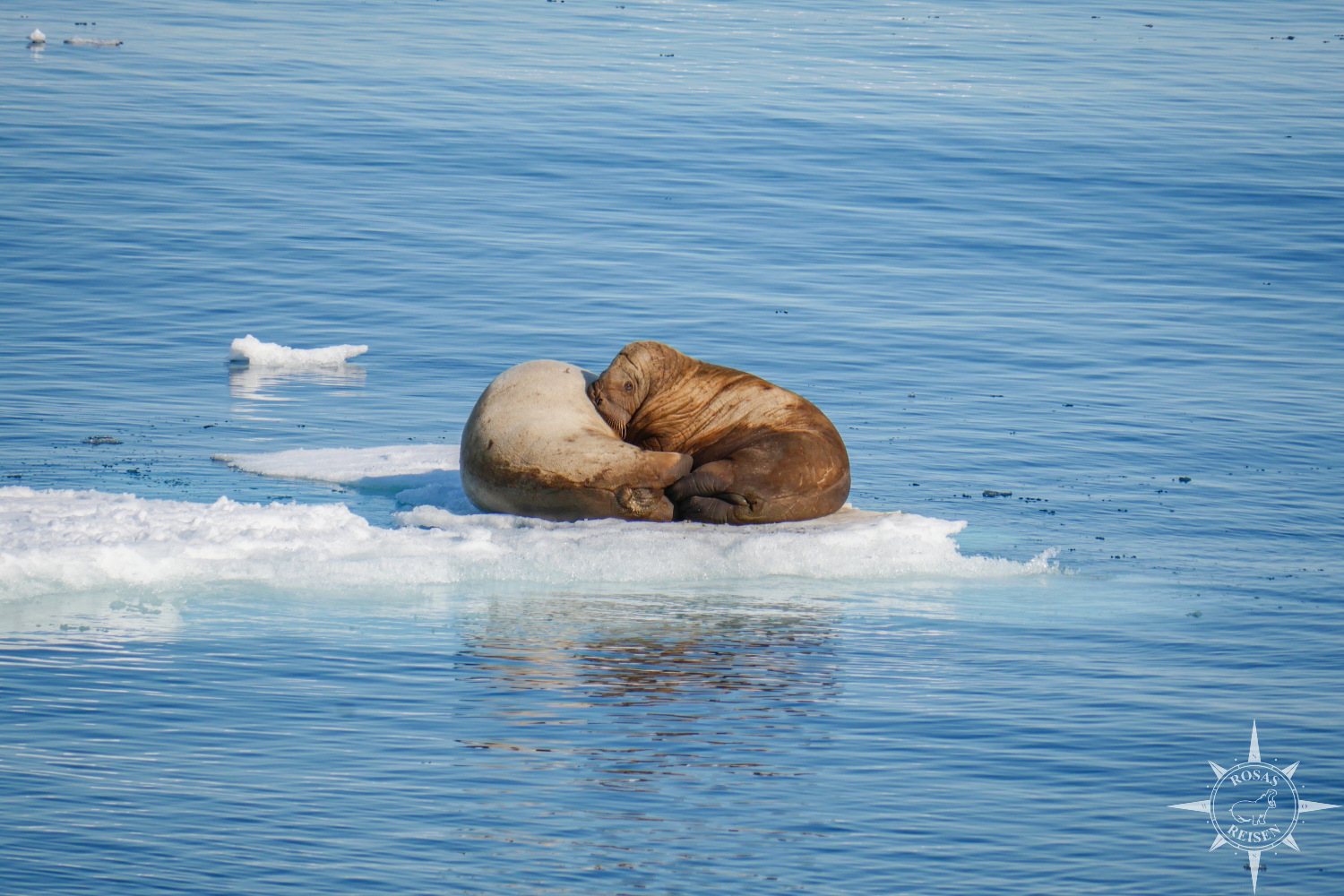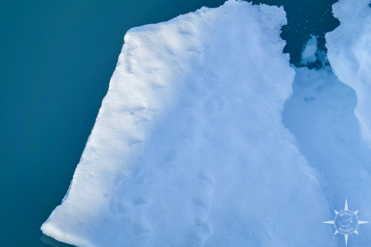 Auf einer Eisscholle lassen sich zwei kuschelnde Walrosse von diesem seltsamen Ding, das da vorbei schippert, zunächst nicht stören. Irgendwann wird es ihnen aber doch unheimlich und sie flüchten ins Wasser. Immer wieder entdecken wir Walrosse und andere Robben auf den umhertreibenden Schollen und das weckt natürlich Begehrlichkeiten beim König der Arktis. Zwar können wir keinen Eisbären entdecken, sehen aber seine Spuren auf einer der Schollen.