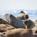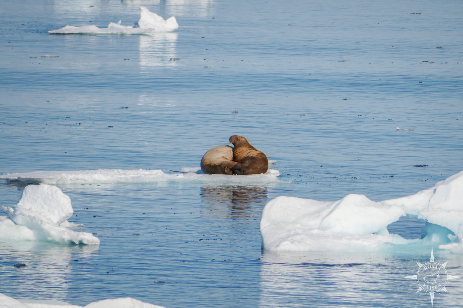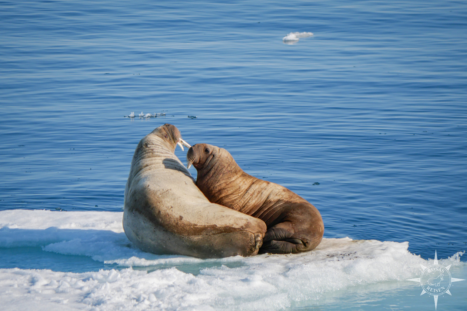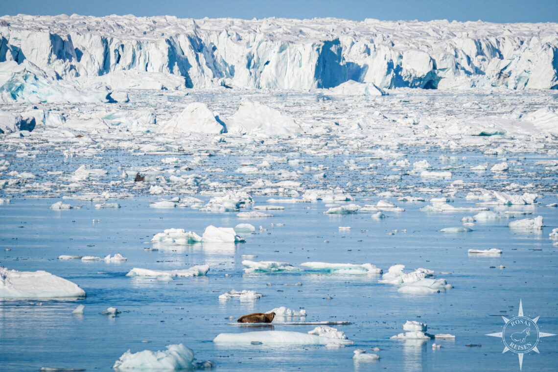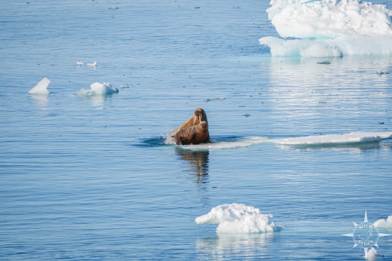 Auf einer Eisscholle lassen sich zwei kuschelnde Walrosse von diesem seltsamen Ding, das da vorbei schippert, zunächst nicht stören. Irgendwann wird es ihnen aber doch unheimlich und sie flüchten ins Wasser. Immer wieder entdecken wir Walrosse und andere Robben auf den umhertreibenden Schollen und das weckt natürlich Begehrlichkeiten beim König der Arktis. Zwar können wir keinen Eisbären entdecken, sehen aber seine Spuren auf einer der Schollen.