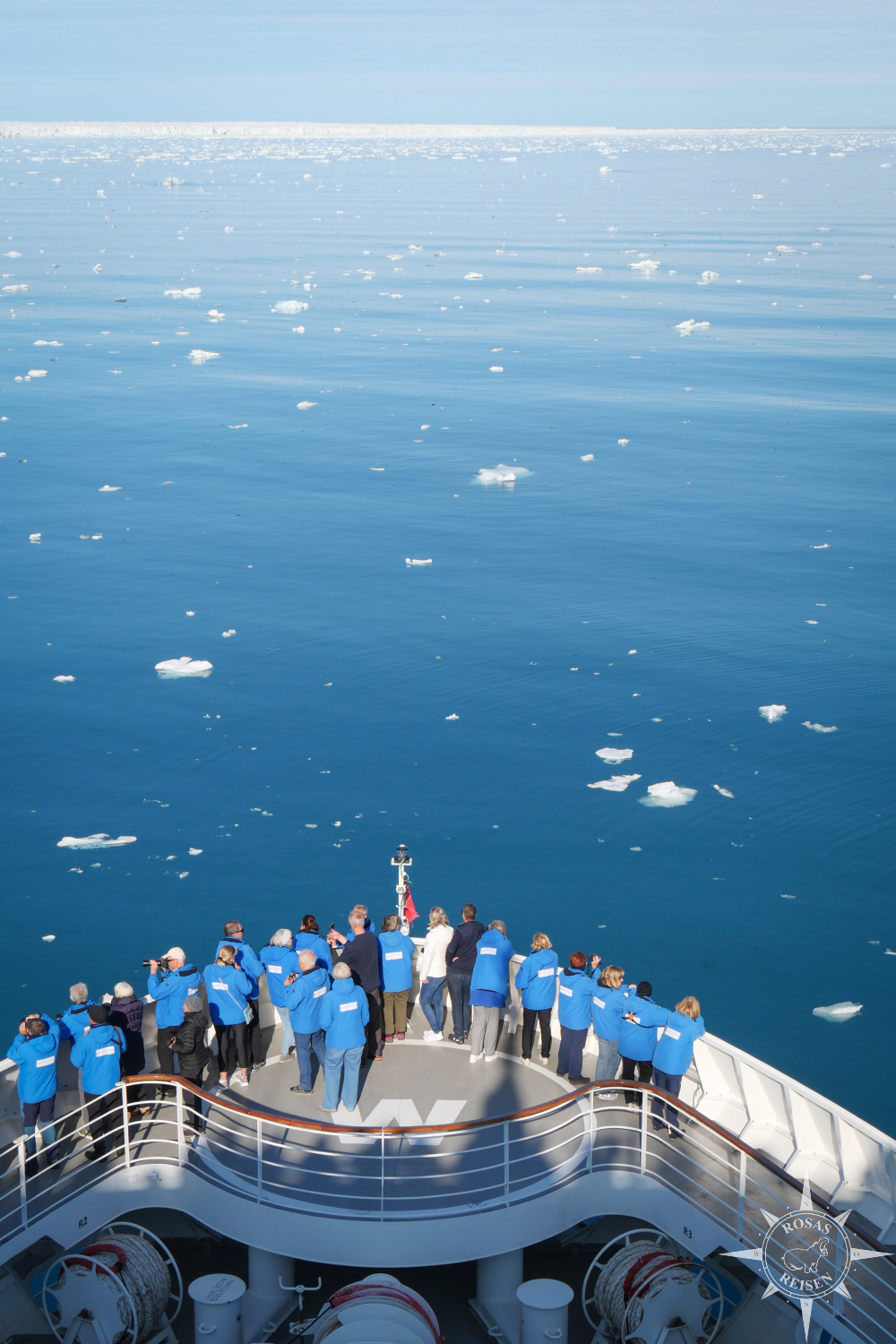 Langsam gleiten wir immer weiter an der Eiskante entlang, lassen uns von immer neuen Ansichten fesseln, auch wenn es kälter und kälter wird und der Finger auf dem Auslöser der Kamera protestiert. Aber um nichts in der Welt möchte ich das hier verpassen. Der Kapitän fasst unseren Aufenthalt schließlich humorvoll und treffend mit den Worten „Was wir hier tun ist nautisch vollkommen sinnlos, aber es macht Spaß!“ zusammen.