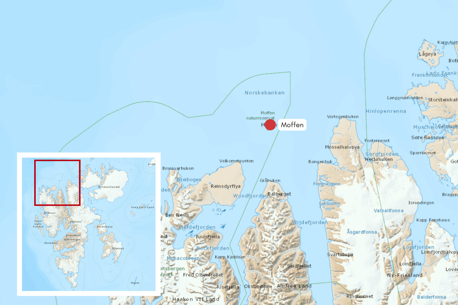 Ganz oben, fast schon am Rand der Welt, liegt Moffen – eine kleine, flache Insel im Norden von Spitzbergen. Rund drei Kilometer lang, bis zu zwei Kilometer breit und inklusive der Lagune in der Mitte etwa fünf Quadratkilometer groß, erinnert sie fast an ein winziges Atoll. Geografisch liegt sie knapp auf dem 80. Breitengrad, am Ausgang des Wijdefjords, zwanzig Kilometer nördlich der Hauptinsel Spitzbergen und nordwestlich der Halbinsel Reinsdyrflya.