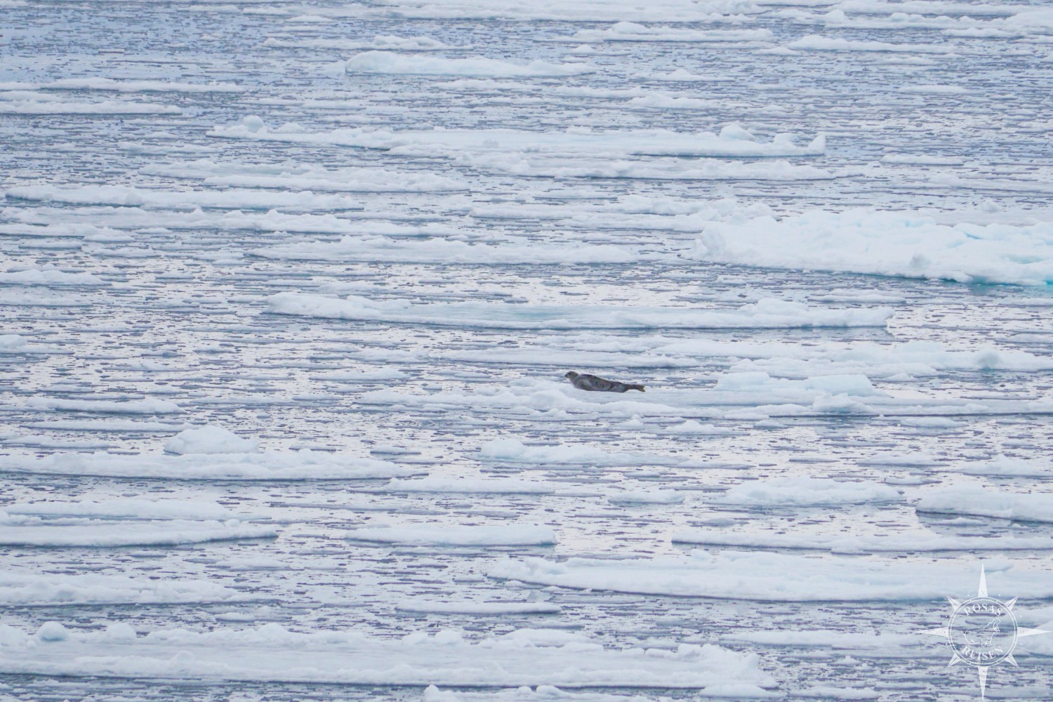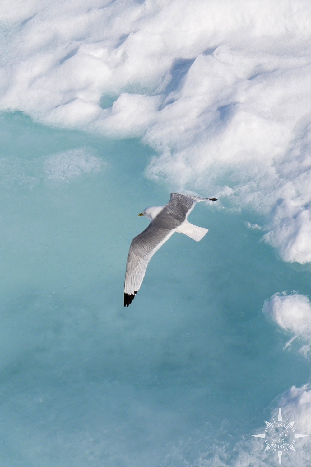 Dabei ist es hier oben nicht leer und tot, falls das jemand denkt. Das Eis wimmelt von Leben! Bald zeigen sich die ersten Vögel: Krabbentaucher, kleine Alkenvögel mit kurzem Schnabel, die sich vor allem von Zooplankton ernähren. Auch Dickschnabellummen, Dreizehenmöwen mit schwarzen Flügelspitzen und Gryllteisten mit roten Füßchen sind unterwegs. Allerdings lassen sich die Möwen mit Abstand am einfachsten fotografieren. 😉
