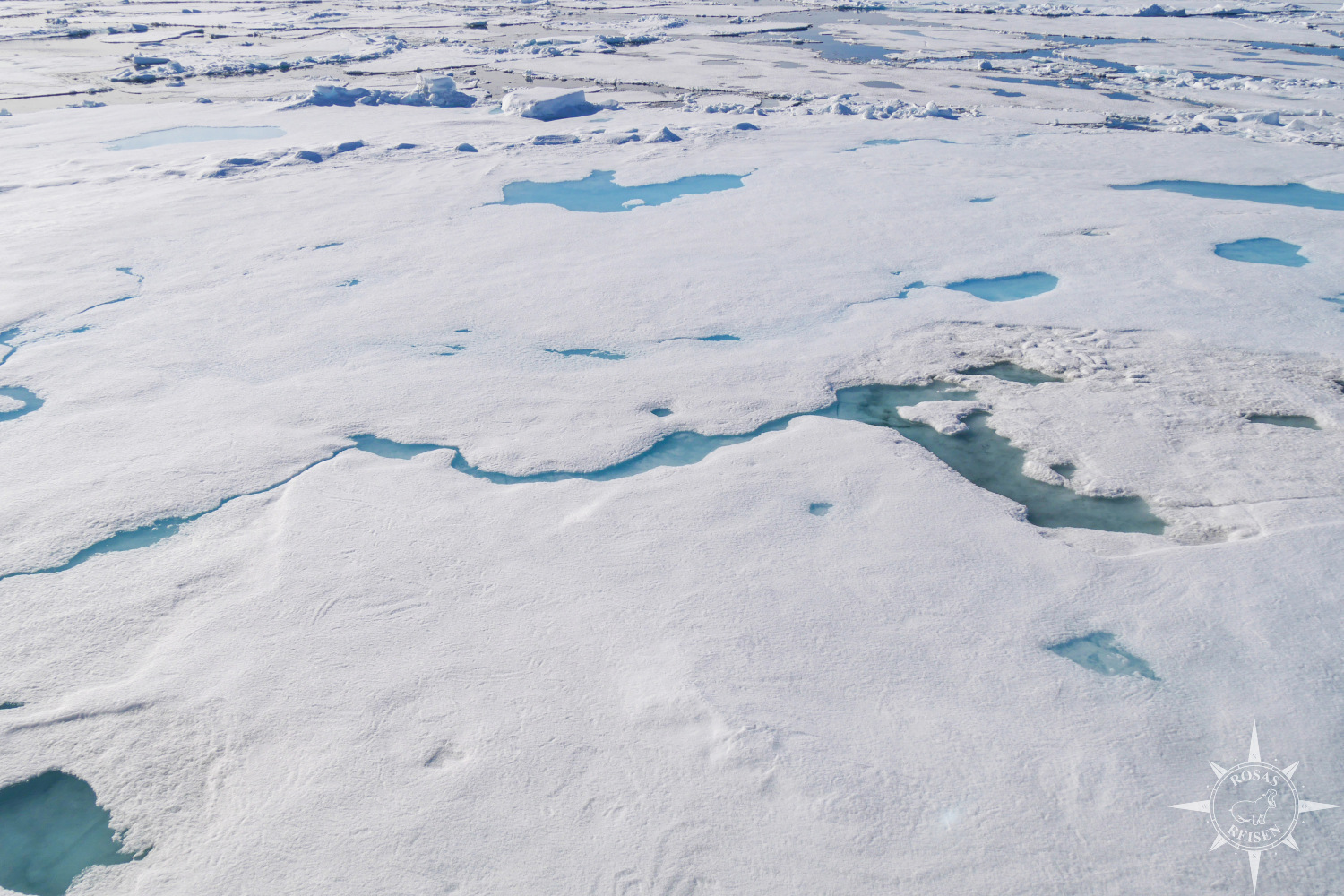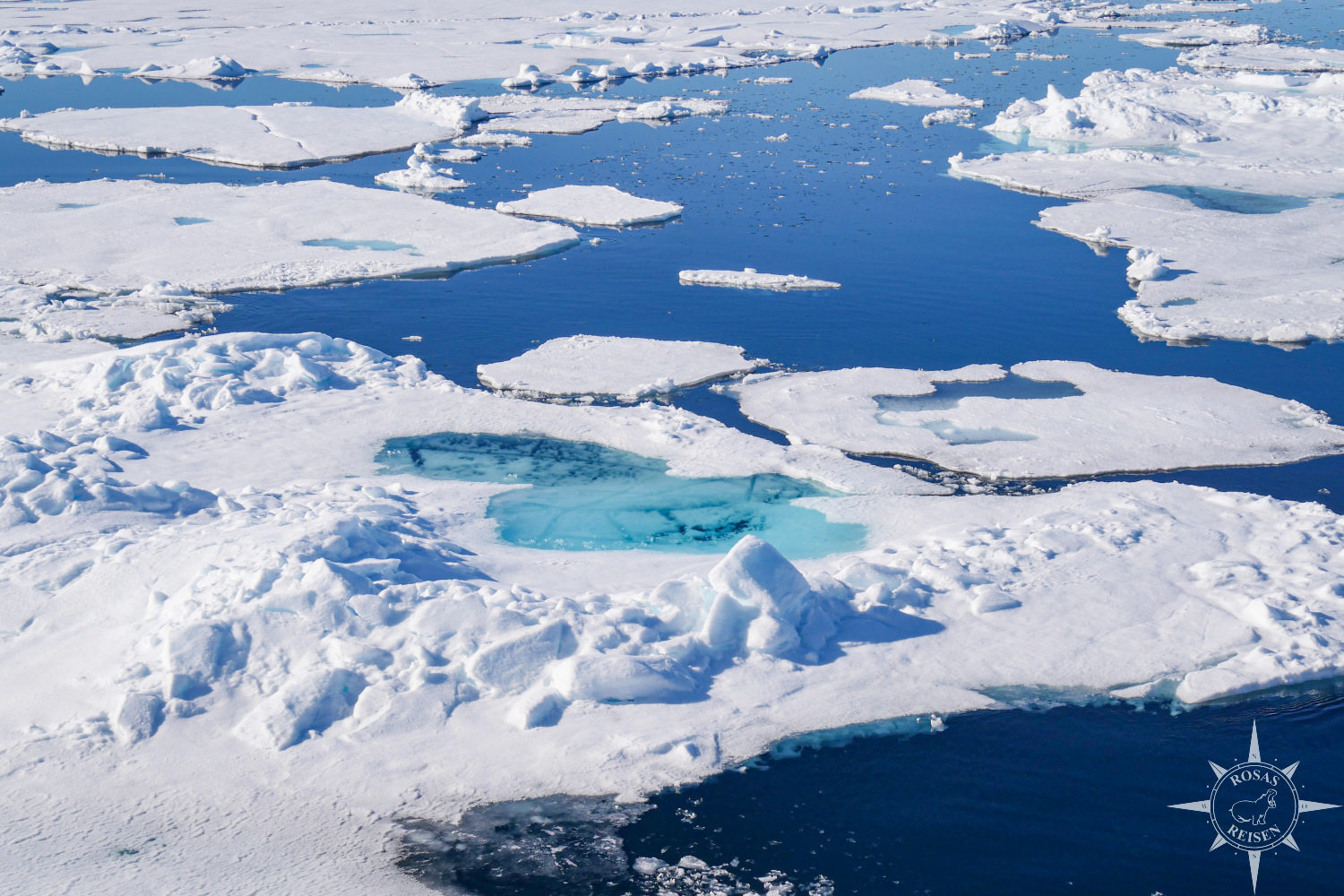 Dann aber wird es Zeit, den Blick endlich nach Norden zu wenden. Das Eis erwartet uns. Eine stille, beinahe surreale Welt aus treibenden Schollen, klaffenden Rissen, tiefblauem Ozean und türkisfarbenen Schmelzwasserseen öffnet sich vor uns. Vorsichtig manövriert das Schiff hinein in diese bizarre Landschaft.