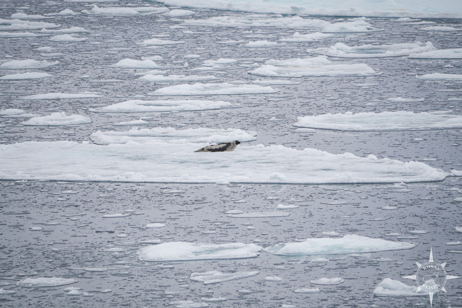 Und dann entdecken wir die Sattelrobben! In unglaublicher Zahl liegen sie auf den Schollen – bis zu zweihundert Tiere, wie unser Kapitän verkündet. Ihr hellgraues Fell mit der markanten dunklen Zeichnung über Rücken und Flanken macht sie unverwechselbar. Diese „Sattelfärbung“ tragen allerdings nur die adulten Tiere. Die Jungtiere, die sogenannten Whitecoats, sind in den ersten Lebenswochen noch schneeweiß und flauschig – auch von ihnen entdecken wir einige.