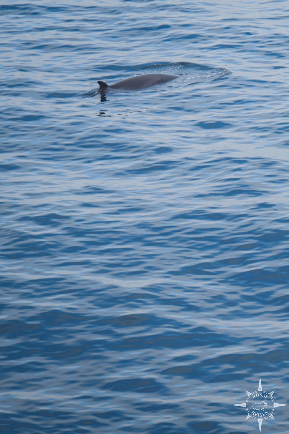 Und wer ganz genau hinsieht, entdeckt auch den ein oder anderen Zwergwal (Balaenoptera acutorostrata). So zwergig ist der übrigens nicht. Er ist zwar der kleinste Vertreter der Bartenwale, wird aber bis zu 10 Meter lang. Er kommt in allen Ozeanen vor und ist damit einer der am weitesten verbreiteten Wale. Zwergwale sind flinke und neugierige Tiere, die sich oft nahe an Schiffe heranwagen, wie man sehen kann.
