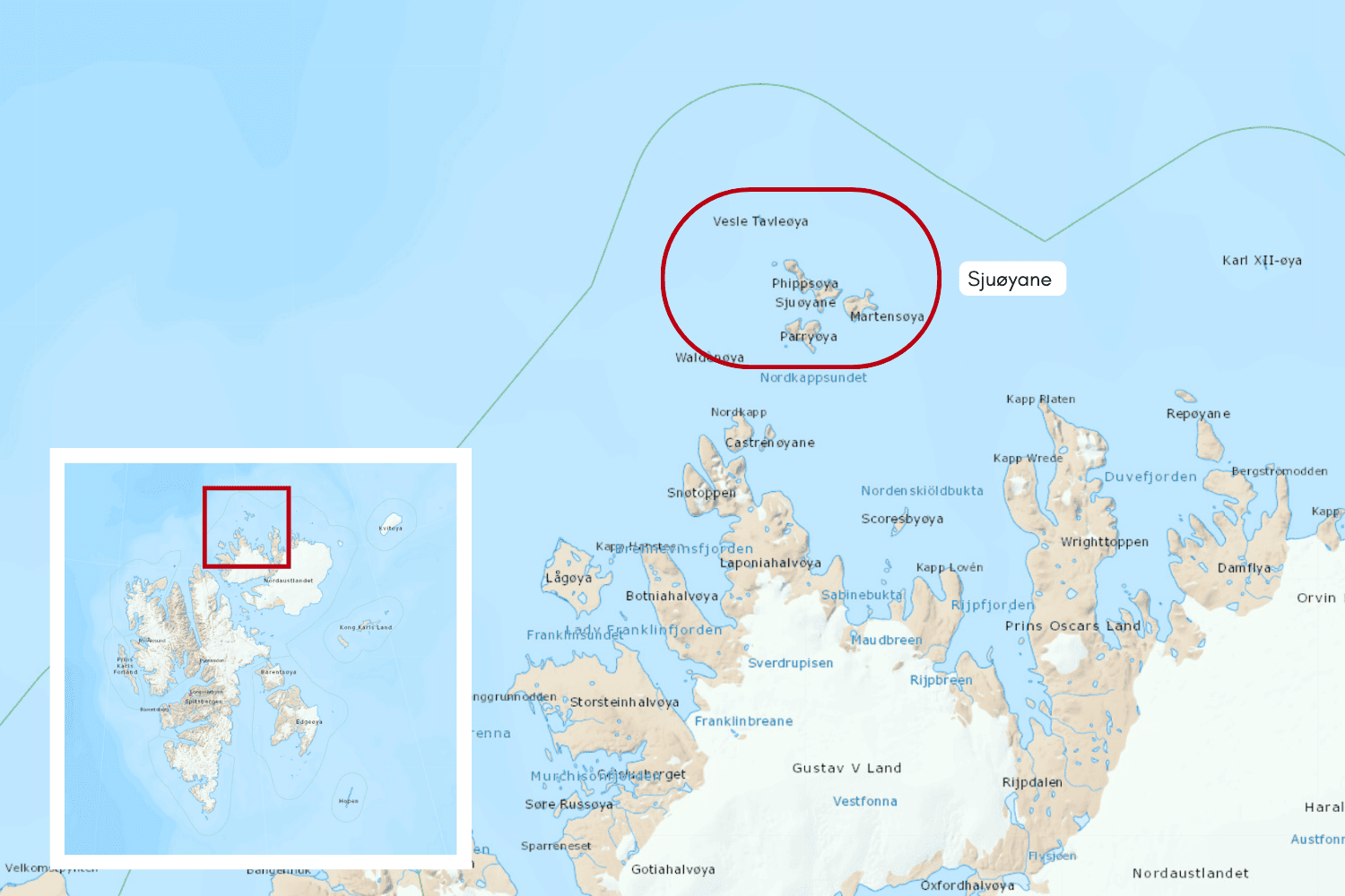 Nur einen Steinwurf entfernt, kaum 80 Meter südöstlich, liegt die winzige Vesle Tavleøya, die „kleine Tafelinsel“. Gemeinsam bilden sie die äußerste Spitze der Sjuøyane, oft eingehüllt von Nebel, im Sommer nur einen Katzensprung von der Packeisgrenze entfernt.