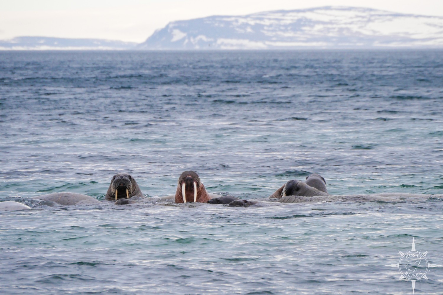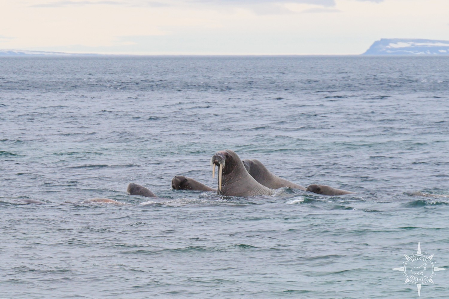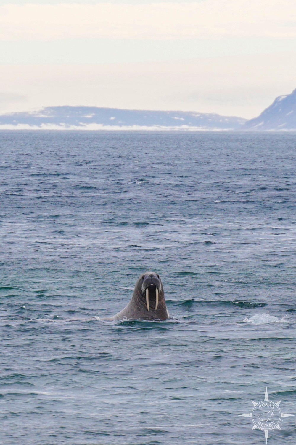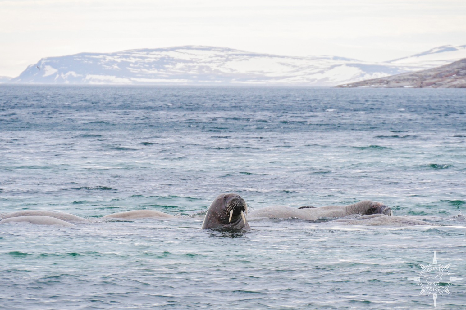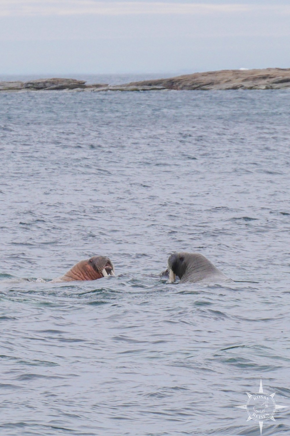 Und werden von einem Begrüßungskommando der niedlicheren Art in Empfang genommen. Im Wasser tummelt sich eine Gruppe Walrosse, die meisten wirken ehrlich interessiert an uns und dem, was wir da so treiben. Ein paar erwecken aber auch den Eindruck, dass sie hinter unserem Rücken über diese seltsamen Ankömmlinge tratschen. Wir hingegen freuen uns einfach nur sie zu sehen.