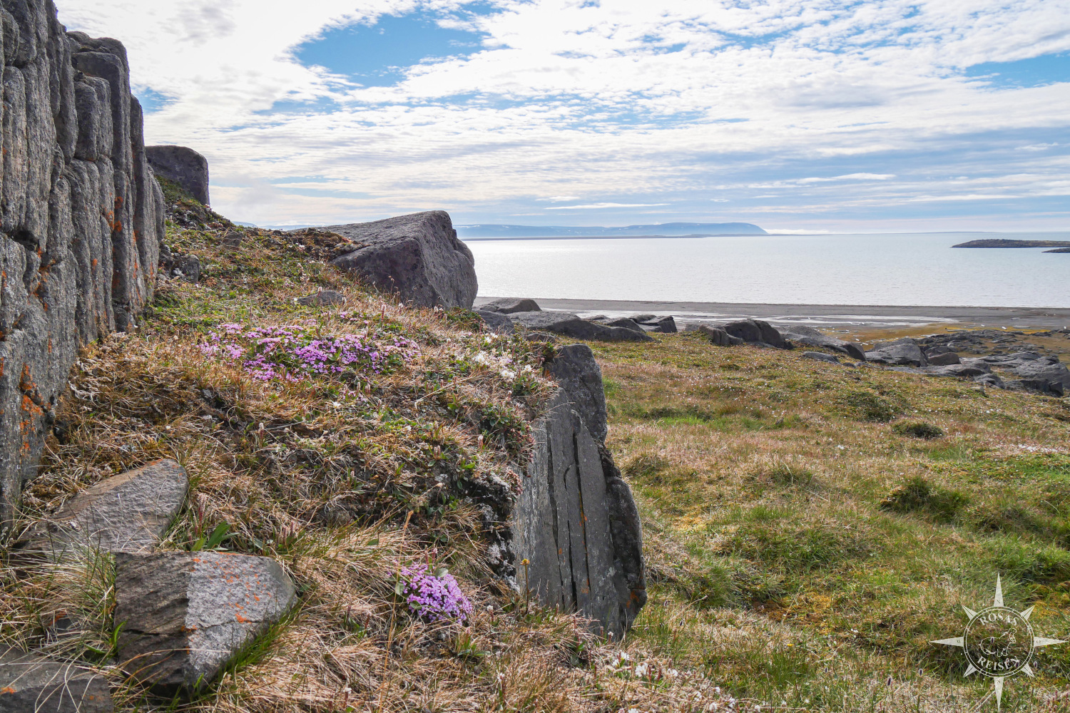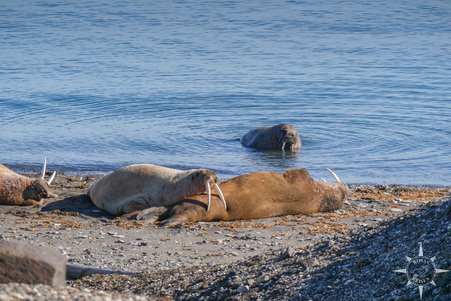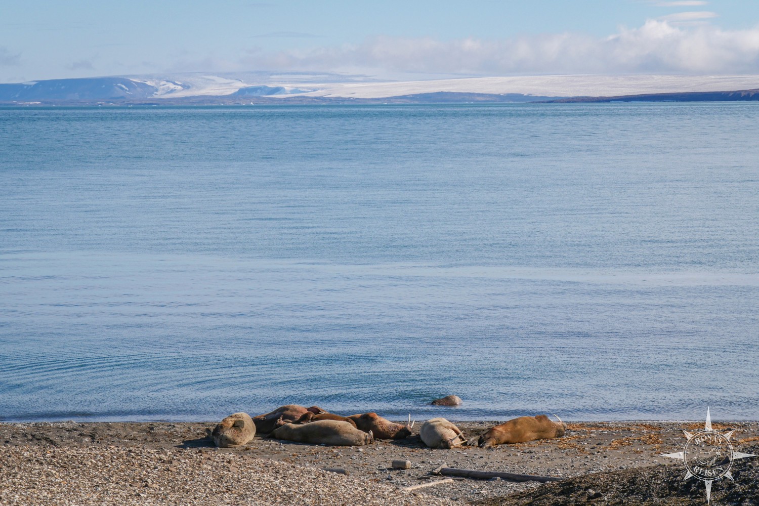 Im Vergleich zu den anderen Orten haben wir hier eine recht kleine Kolonie, die auch gut von einem patrouillierenden Walross vom Wasser aus bewacht wird. Dementsprechend verhalten wir uns wie immer vorsichtig und leise. Gar nicht so einfach auf dem Kiesstrand. Um den zu erreichen, mussten wir von der Landestelle einen Hügel erklimmen.