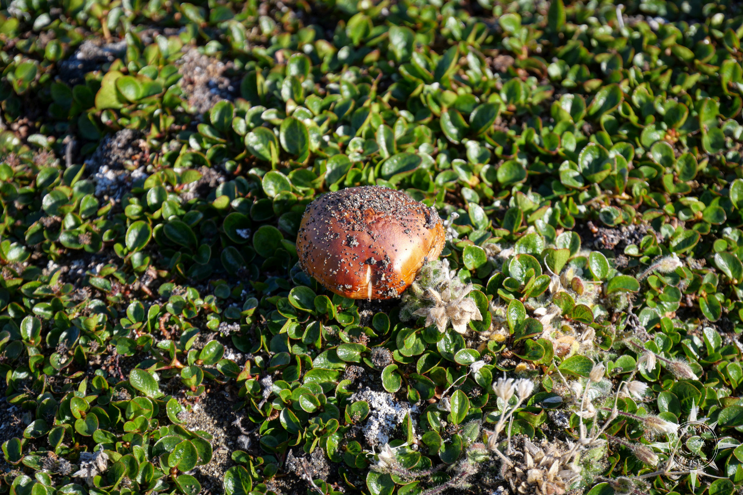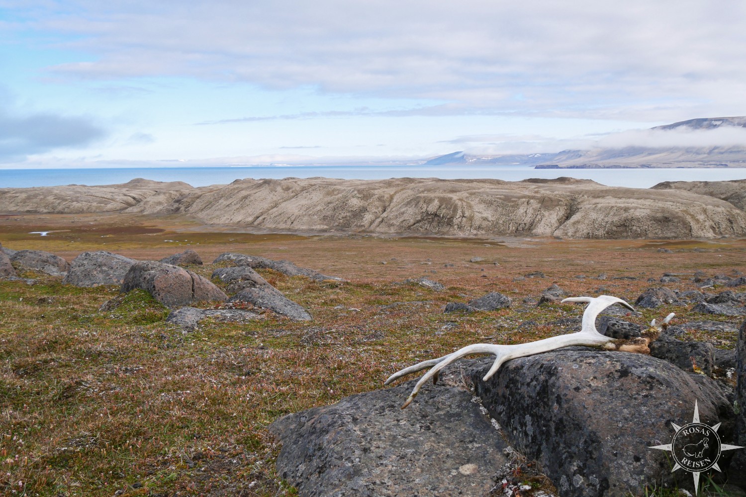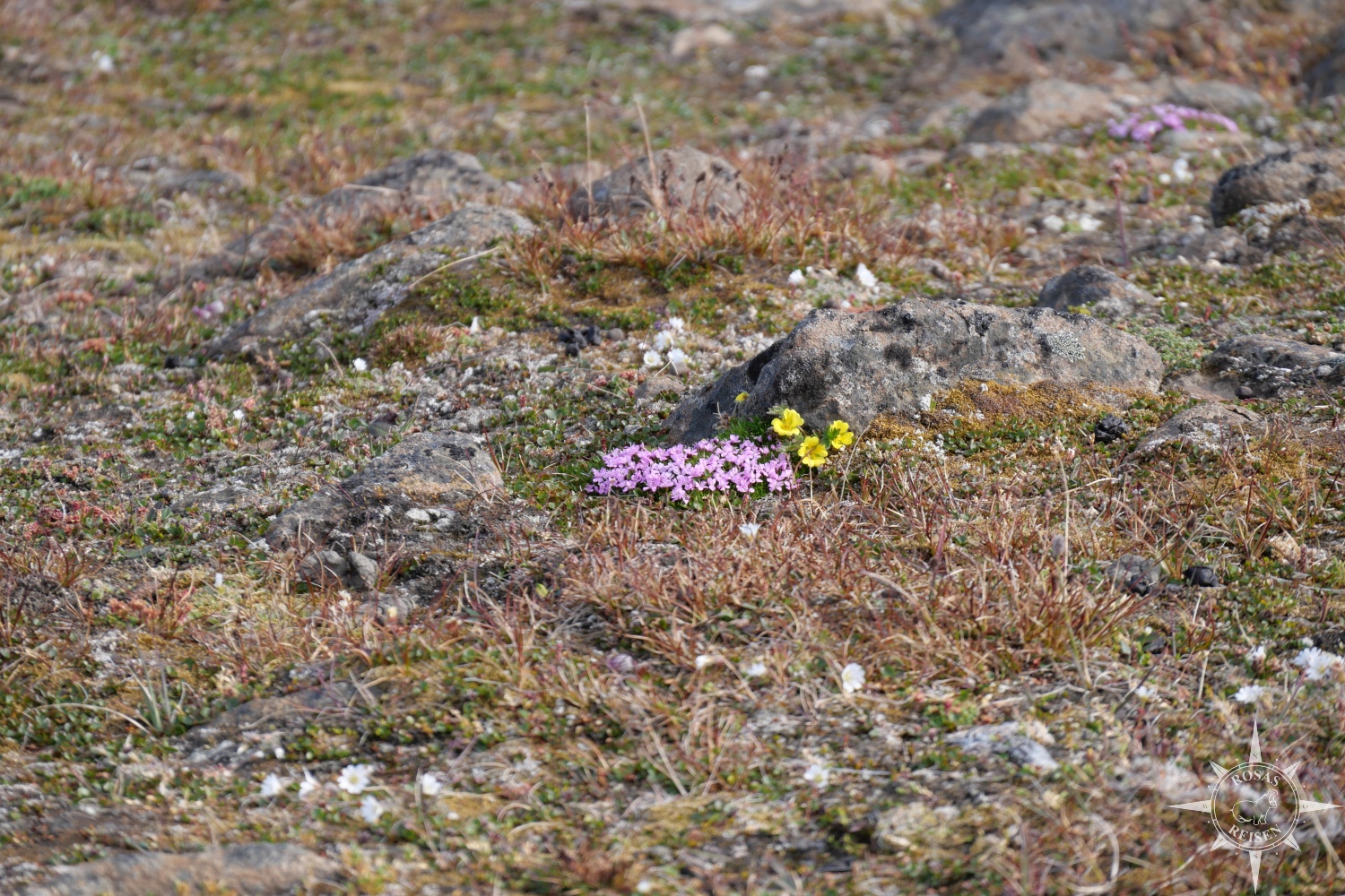 Unter meinen Füßen federt der dicht bewachsene Boden, als ich mich langsam nähere. Das ist ein Zeichen, dass es der Tundra hier noch gut geht. Das Gletschereis muss sich hier schon vor langer Zeit zurückgezogen haben, denn die Bodenbildung ist weit fortgeschritten. Sogar einige Pilze in Golfballoptik entdecke ich zwischen den kleinen Pflanzen. Die abgeworfene Geweihstange daneben sieht selbst aus wie ein Rentier. In den steinigen Absätzen aus Diorit lässt sich außerdem das Nest einer Schneeammer entdecken, die flink und fast unbemerkt zwischen den Felsen huscht.