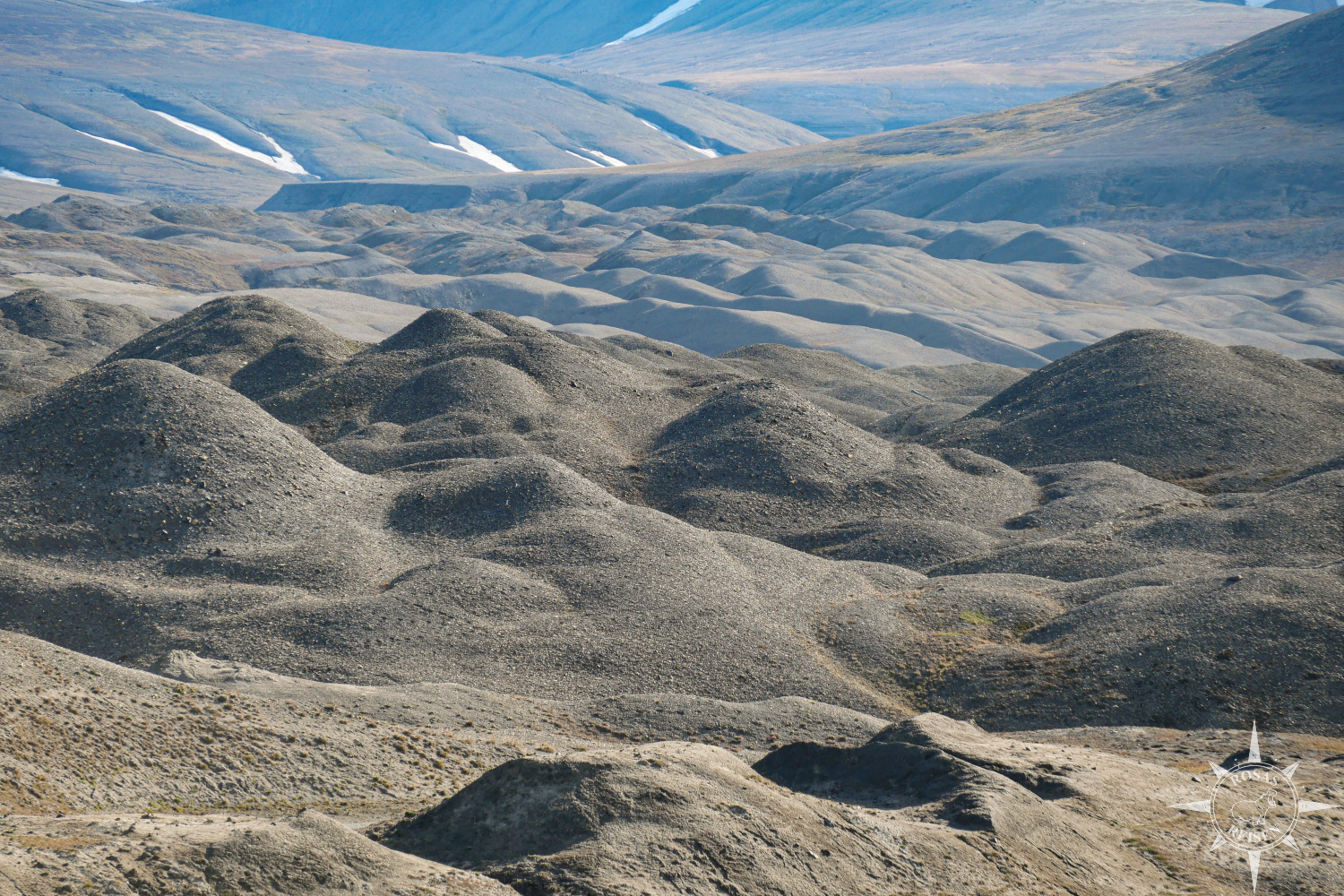 Hinter diesem kleinen ökologischen Paradies öffnet sich in der Ferne allerdings ein ganz anderes Bild: Ödland. Es handelt sich leider um das Zukunftsszenario für große Teile von Svalbard. Weit erstreckt sich die trostlose Landschaft, gezeichnet von ablaufendem Wasser, karg und nur spärlich bewachsen.
