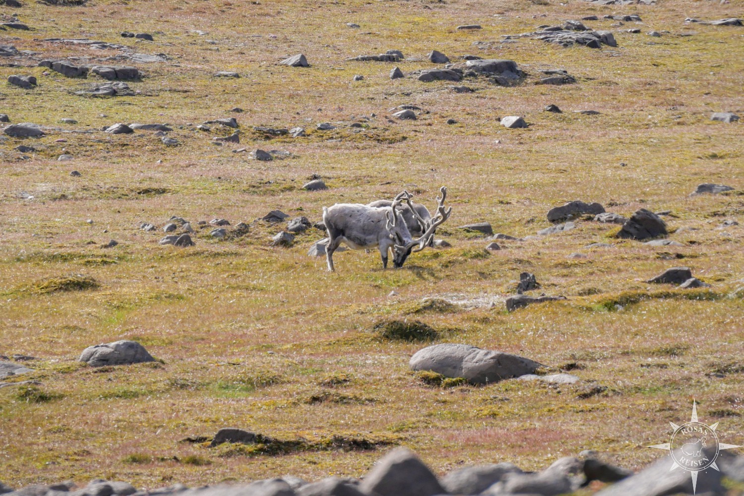 Rechts geht es herunter zu den Walrossen, aber nach links eröffnet sich ein großer, bewachsener Talkessel. Und in dem wartet nun etwas, das ich bisher immer nur von sehr, sehr weit entfernt beobachten konnte: Das Svalbard-Rentier!