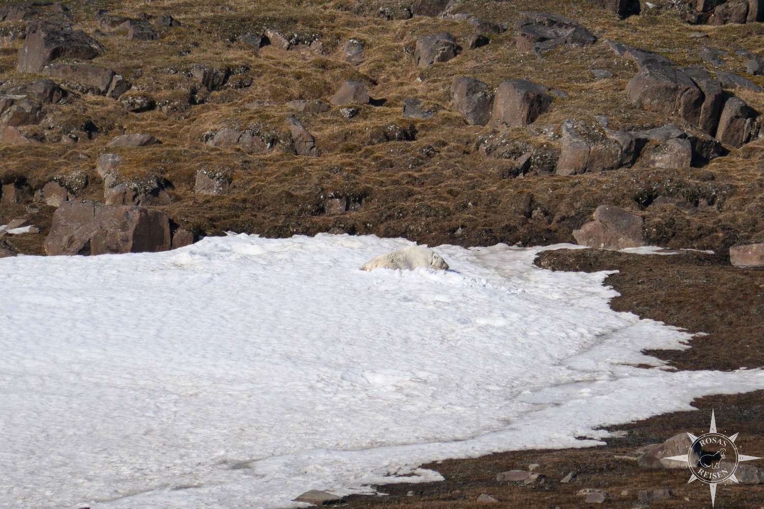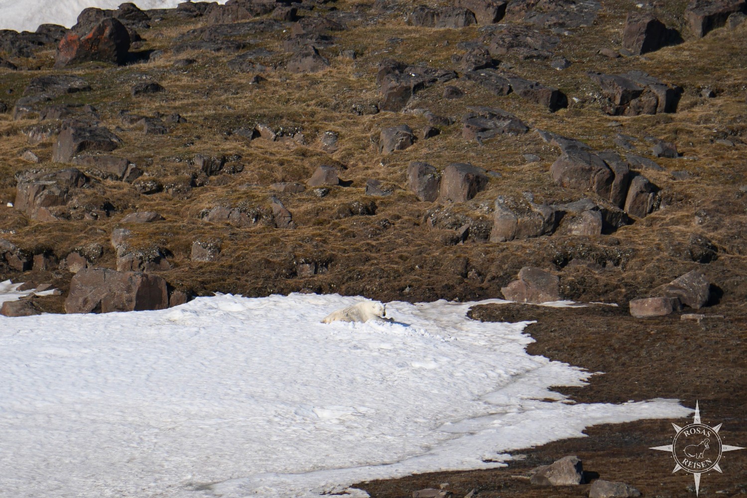 Apropos Bär, was treibt denn der Grund unser Evakuierung so? Der spielt. Er rutscht bäuchlings über Schneefelder und chillt in der Sonne. Durch unsere Ferngläser können wir erkennen, dass er ein Halsband mit Sender trägt. An wen das wohl sendet? Auf diese Frage finde ich leider keine Antwort und so begnüge ich mich damit, dem König der Arktis beim Sonnenbaden zuzuschauen und mich zu freuen, dass ich zumindest einen kurzen Blick in die Würzburger Hütte werfen konnte. Jetzt so ein Wurstburger wäre eigentlich ganz nett. Für mich allerdings bitte vegetarisch, wenn’s geht!
